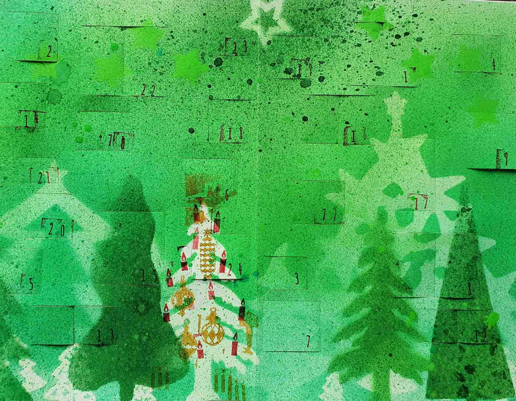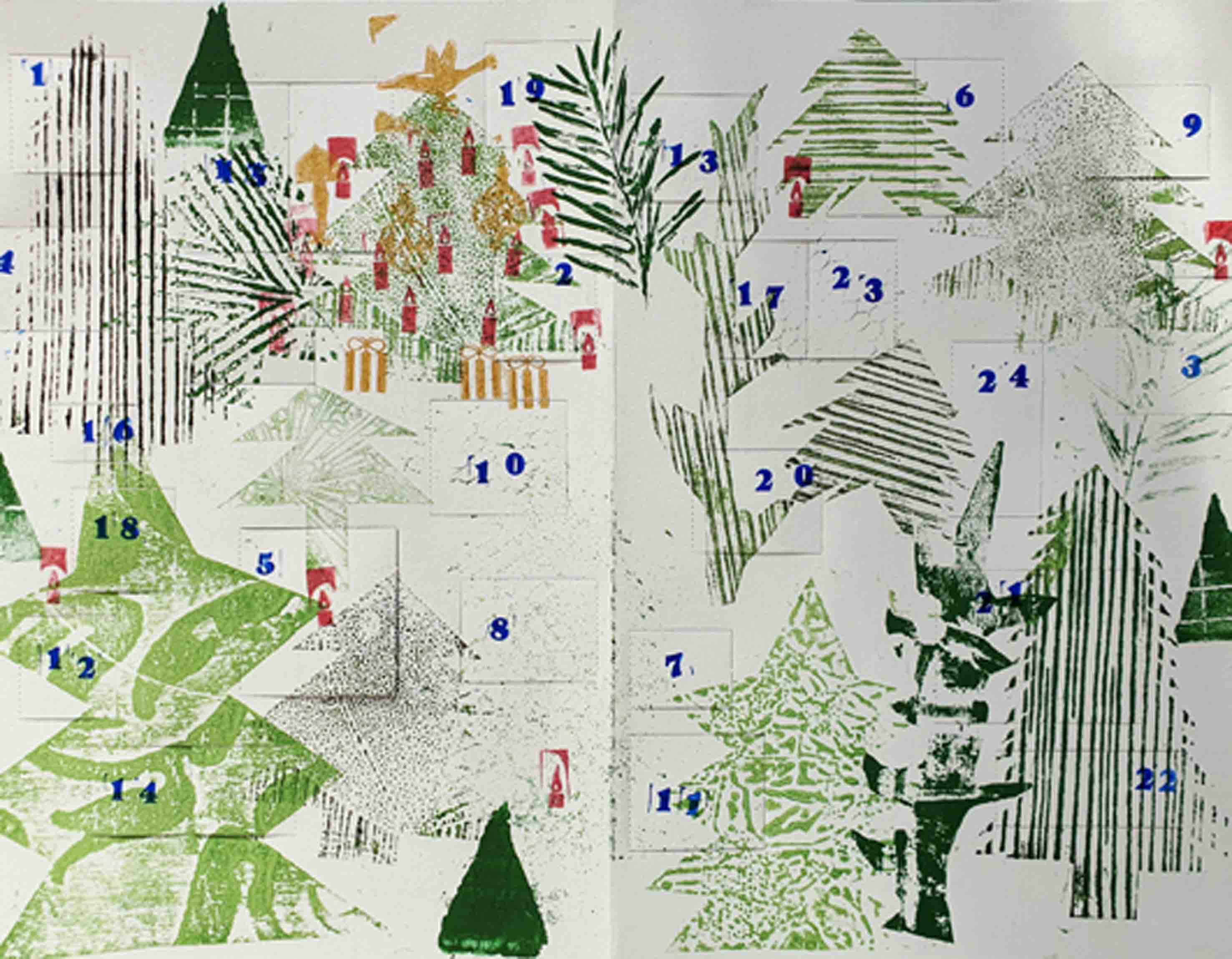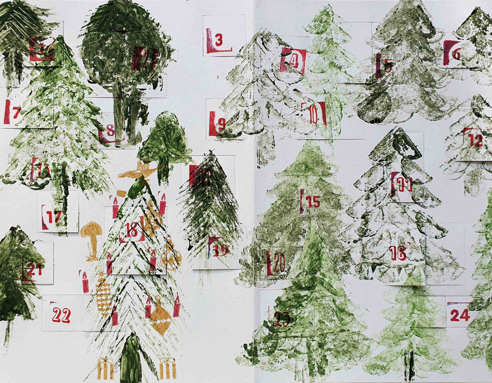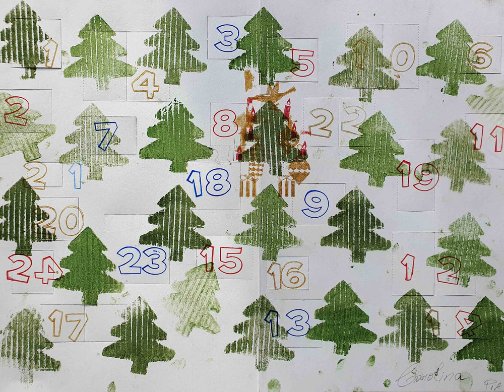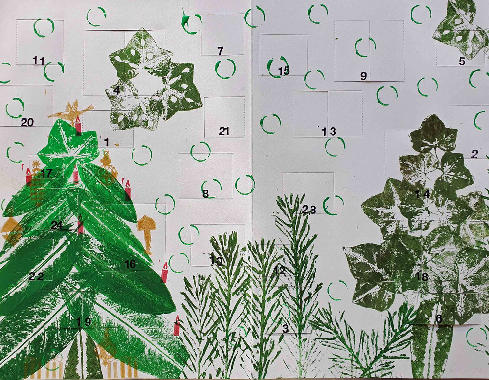 Der PiA-1-Kurs hat sich mit dem Thema Tannenbaum beschäftigt und verschiedene Drucktechniken erprobt: Kartoffel-Rote-Beete-Druck, Styrenedruck, Materialdruck, Tapetendruck, Korkdruck, Siebdruck und Blätterdruck. Die künftigen Erzieherinnen und Erzieher erhielten dadurch eine breite Palette an Anregungen zur Gestaltung eines Adventskalenders in der Kita-Praxis.