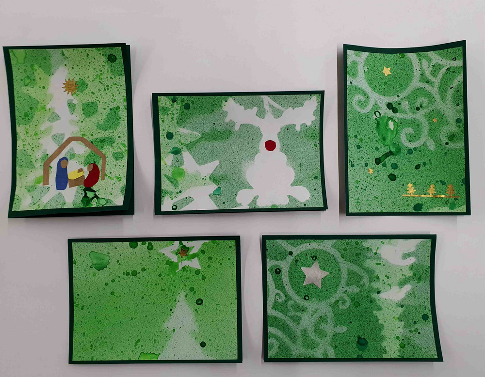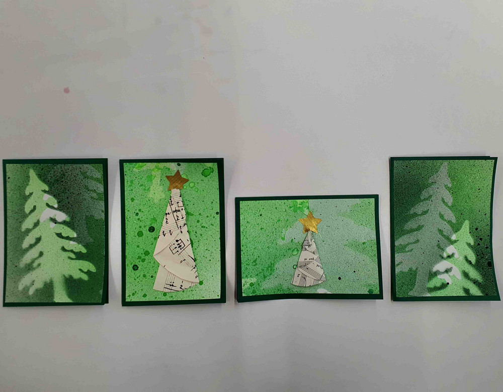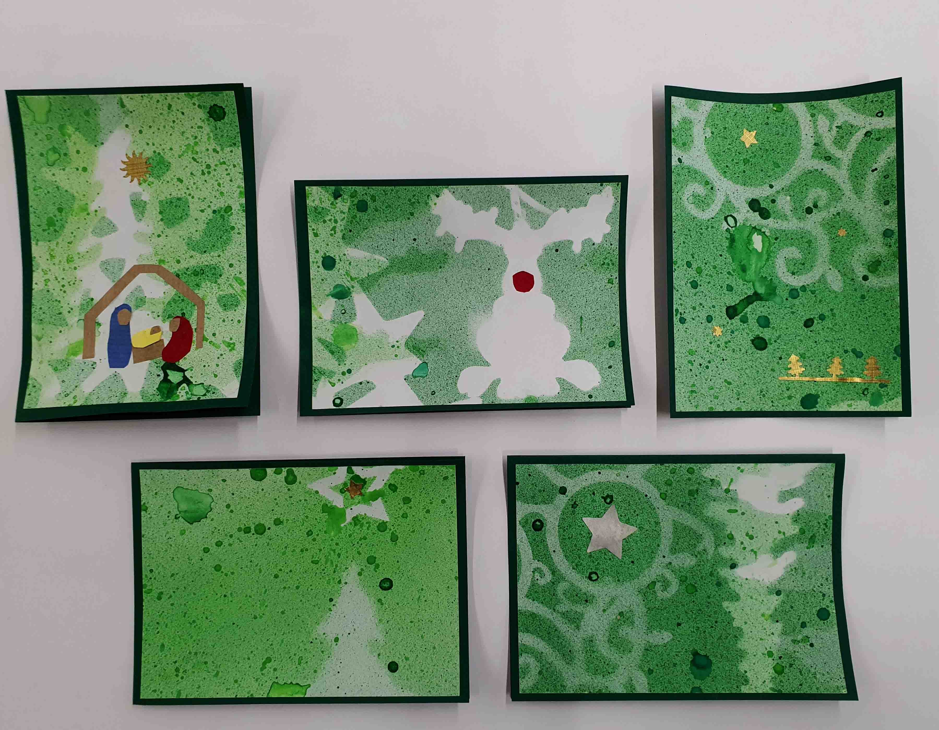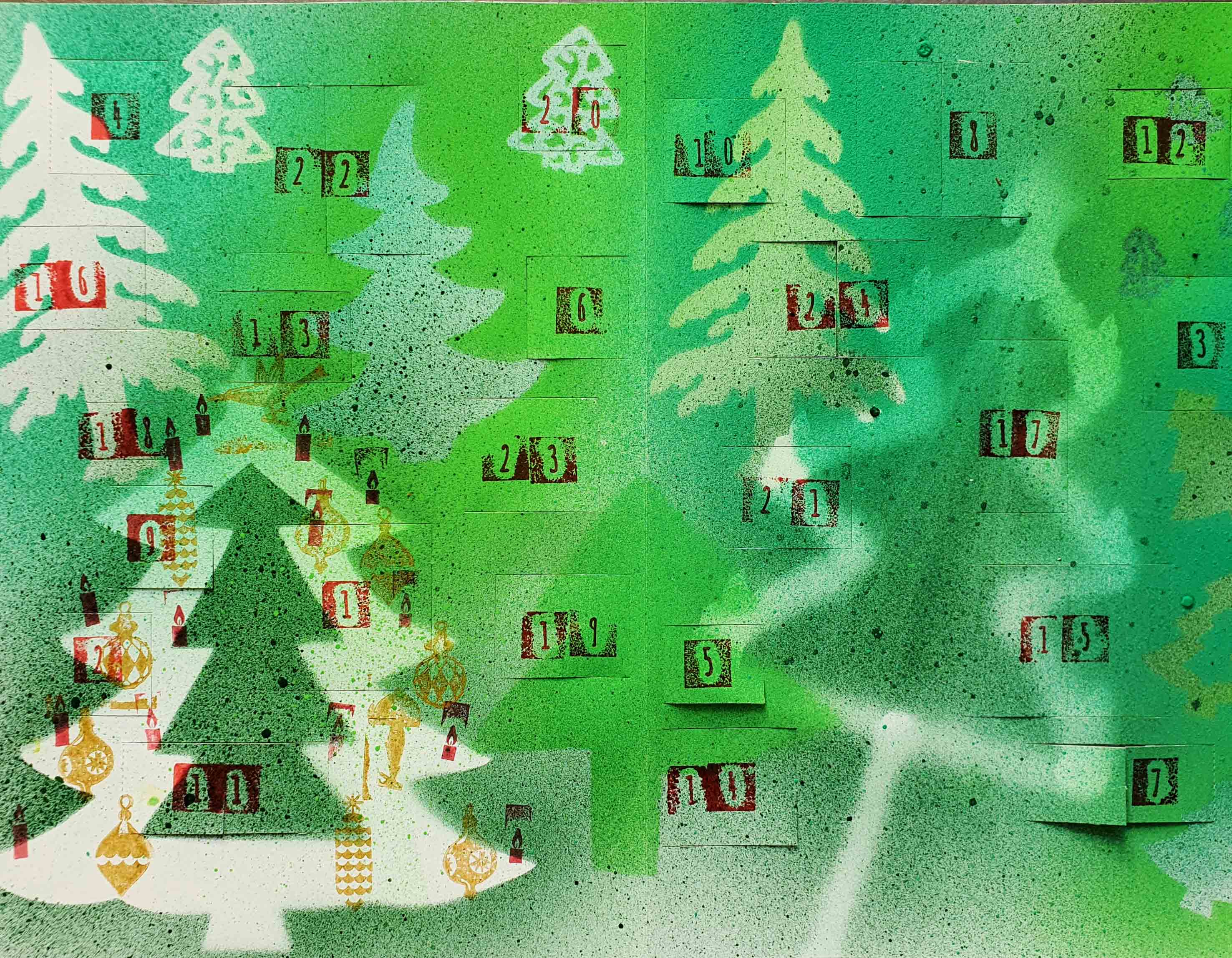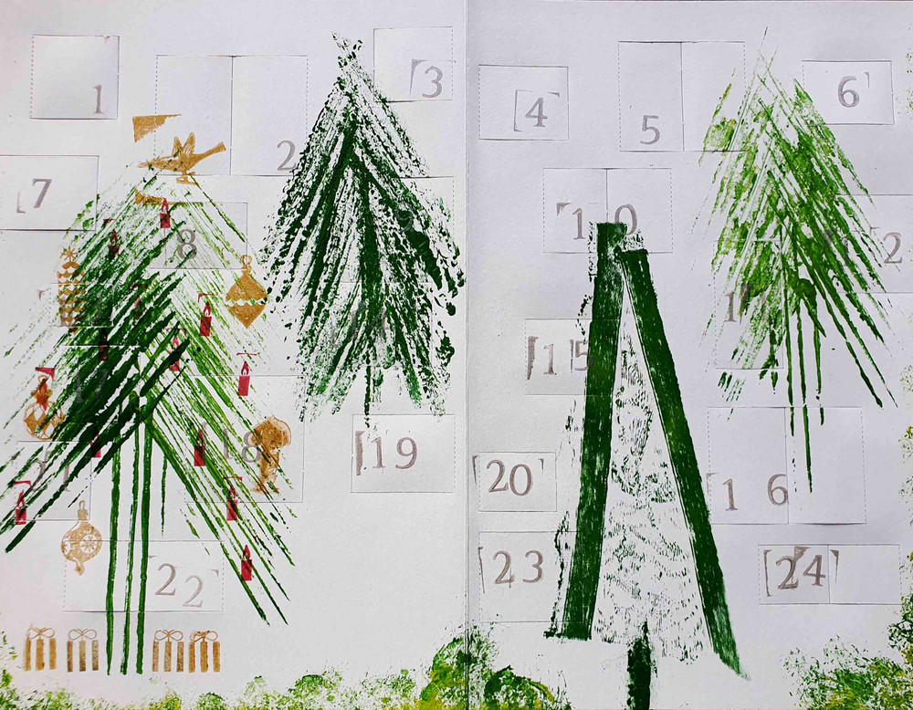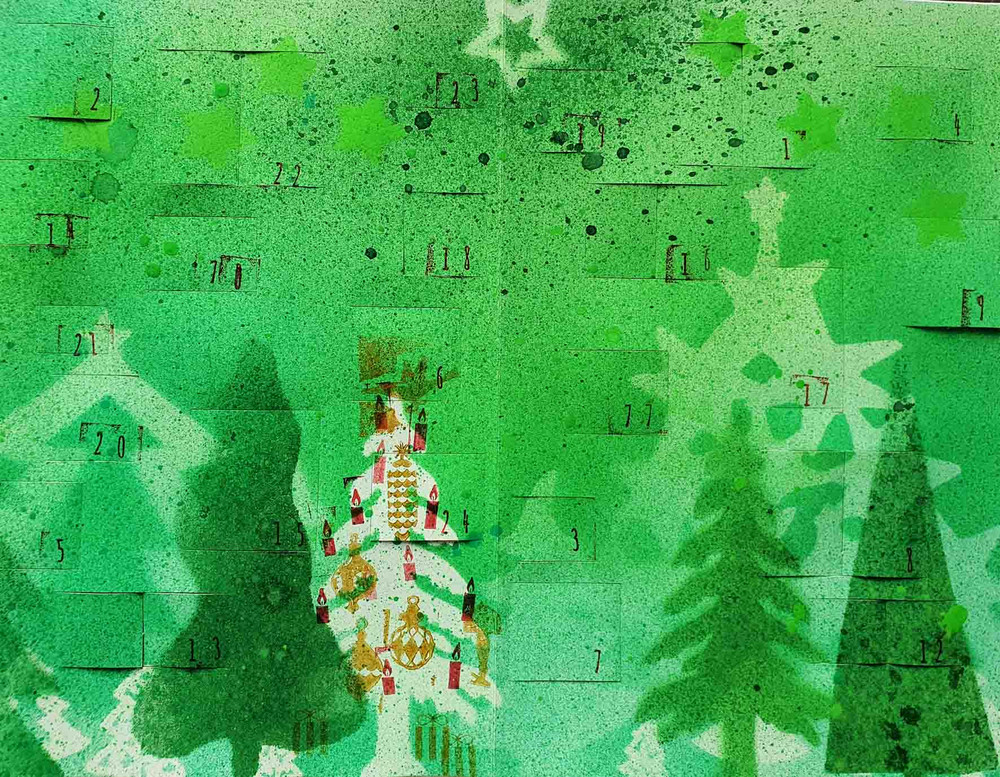 Der PiA-1-Kurs hat sich mit dem Thema Tannenbaum beschäftigt und verschiedene Drucktechniken erprobt: Kartoffel-Rote-Beete-Druck, Styrenedruck, Materialdruck, Tapetendruck, Korkdruck, Siebdruck und Blätterdruck. Die künftigen Erzieherinnen und Erzieher erhielten dadurch eine breite Palette an Anregungen zur Gestaltung eines Adventskalenders in der Kita-Praxis.