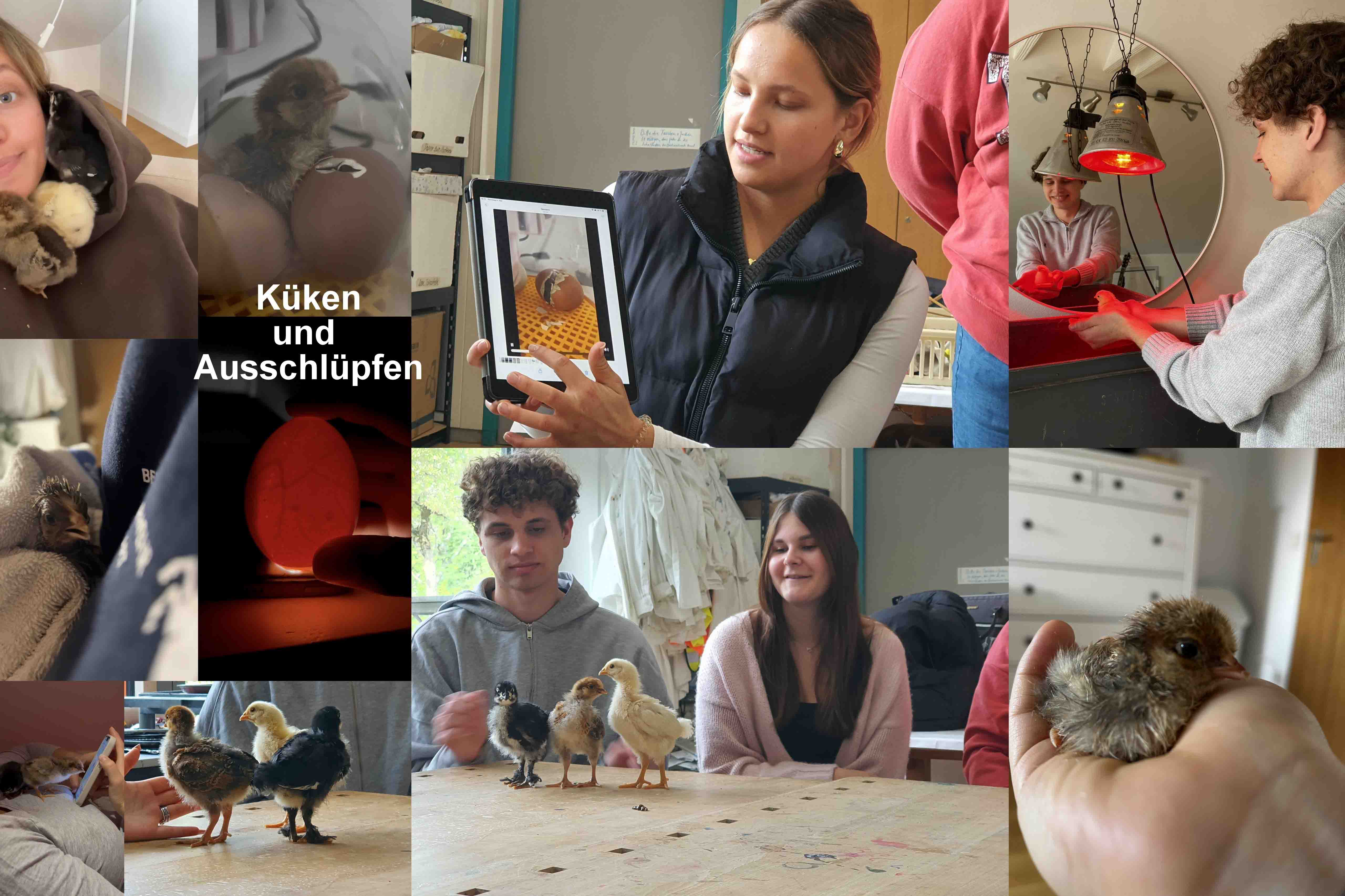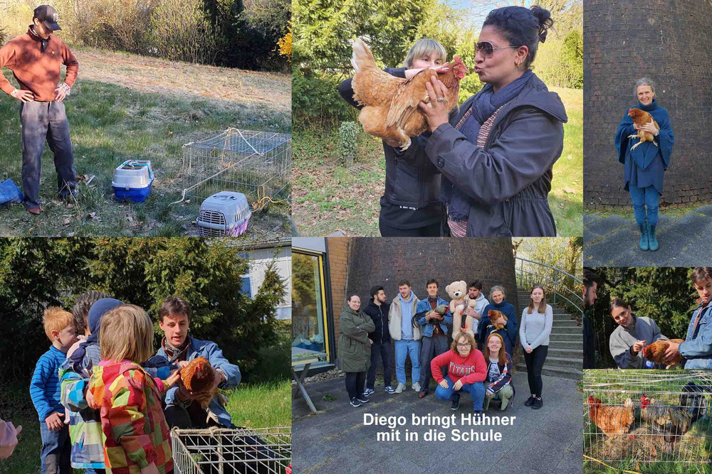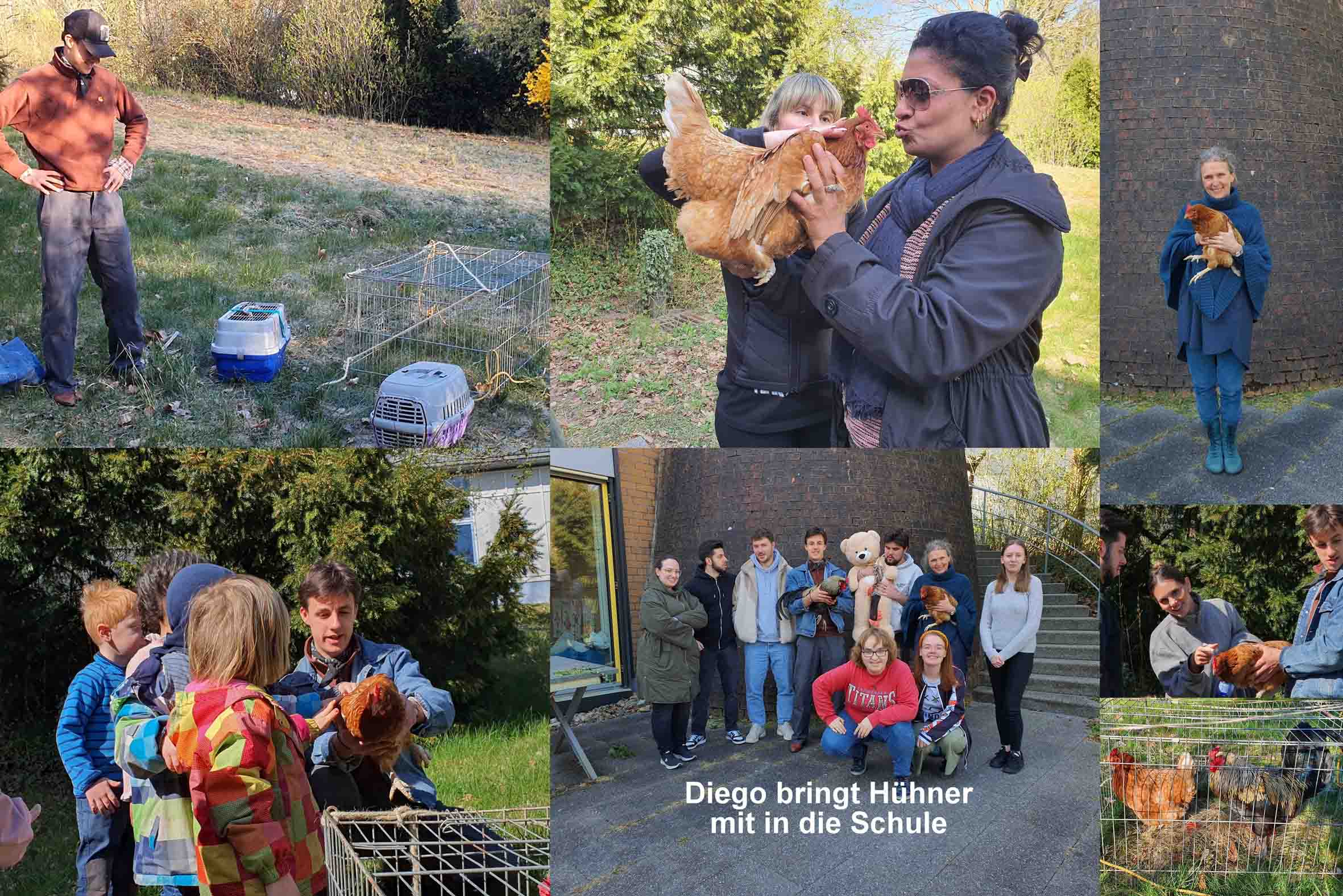 Aufgrund dieser Fragen ging des öfteren eines der Fenster in den oberen Etagen auf und wissbegierige Studierende schauten interessiert heraus, die herbeigeeilten Kinder aus dem Kindergarten der Evang. Fachschule fragten uns Löcher in den Bauch und durften die Hühner mit Körnern füttern, denn der Oberkurs arbeitete im Lernfeld „Naturwissenschaft erfahrbar machen“ am Thema Hühner. Diego brachte mit der S-Bahn das Federvieh mit in die Fachschule. Der Hahn hatte in der S-Bahn bereits siebenmal gekräht.