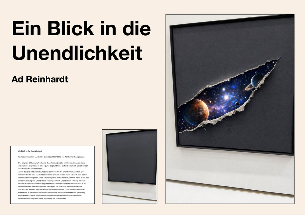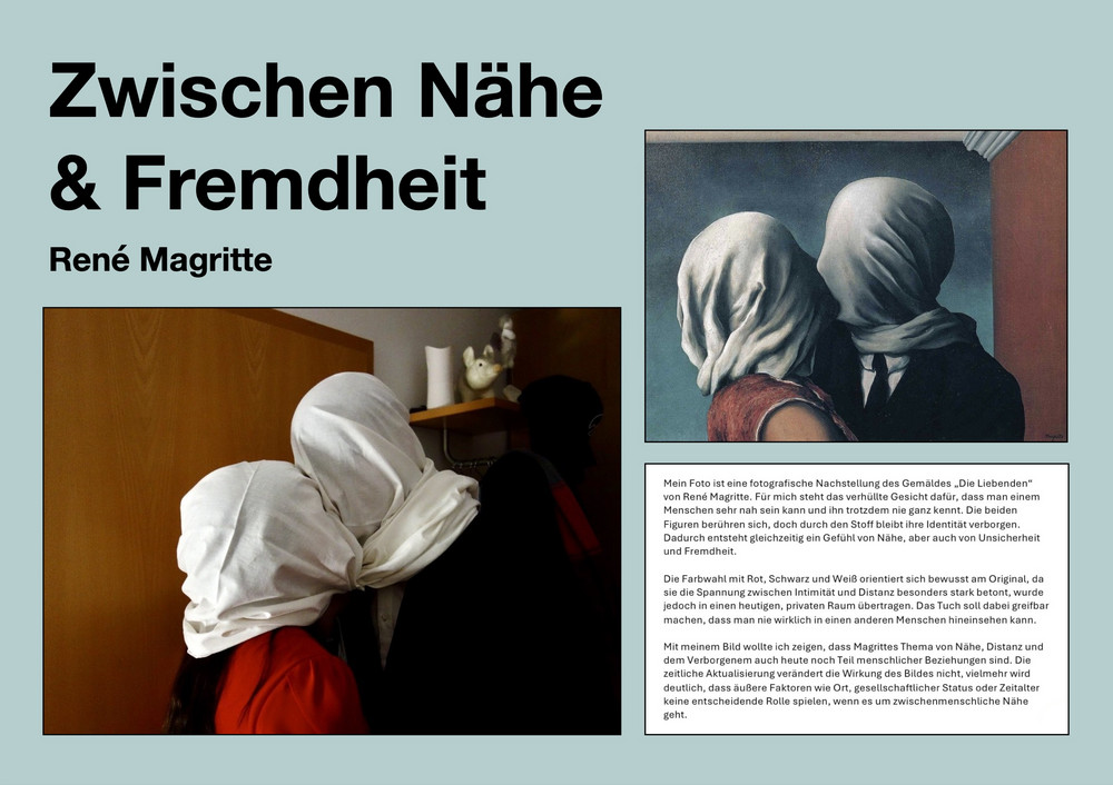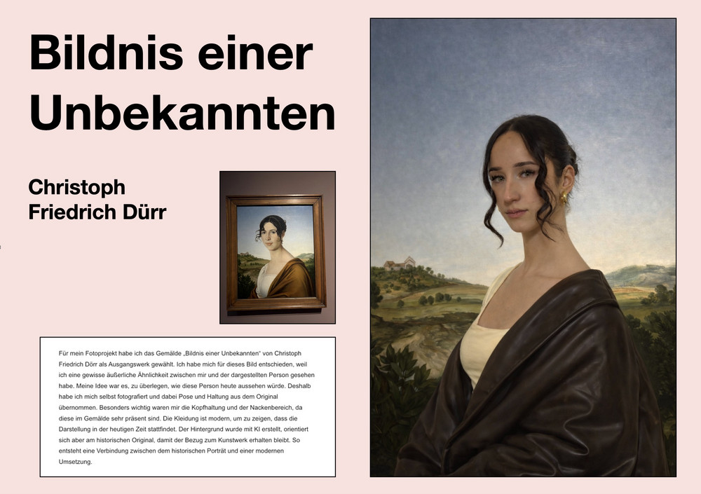 Auf dieser Grundlage entstanden fotografische Arbeiten, die sich inhaltlich oder gestalterisch auf das gewählte Kunstwerk beziehen, es verfremden oder ergänzen. Die Schülerinnen setzten sich dabei mit Möglichkeiten der fotografischen Inszenierung, Interpretation und Veränderung auseinander. Neben fotografischen Techniken kamen auch digitale Bildbearbeitung sowie KI-gestützte Werkzeuge zum Einsatz.