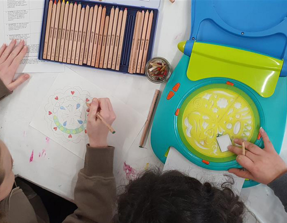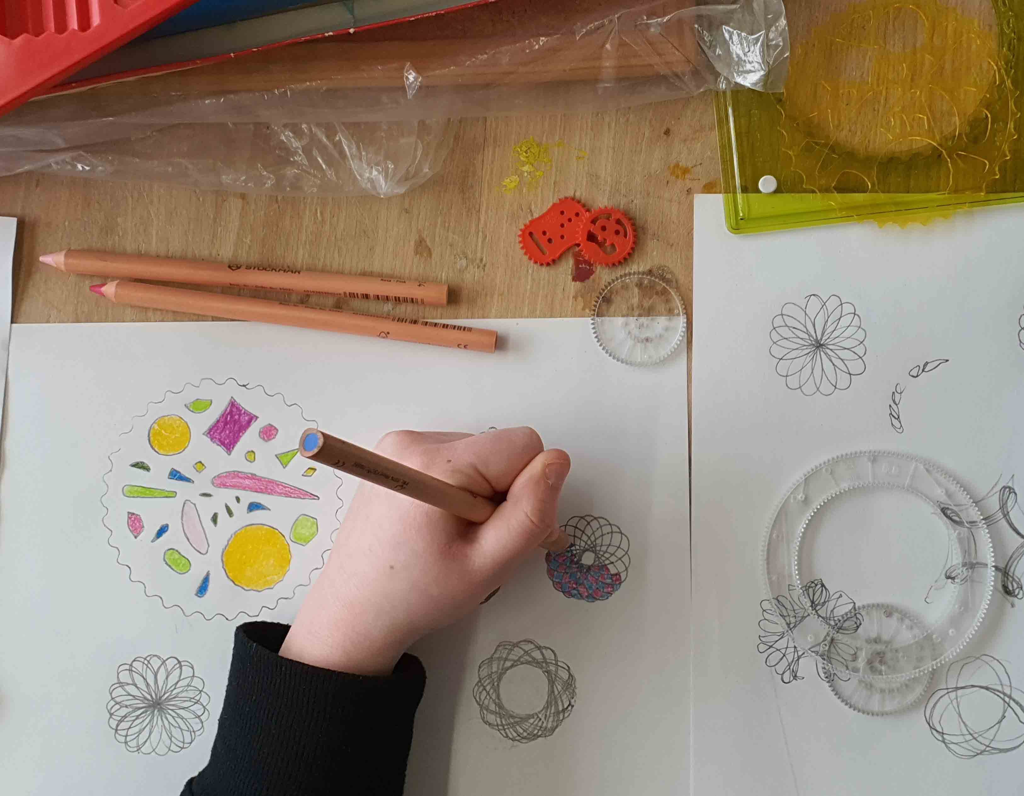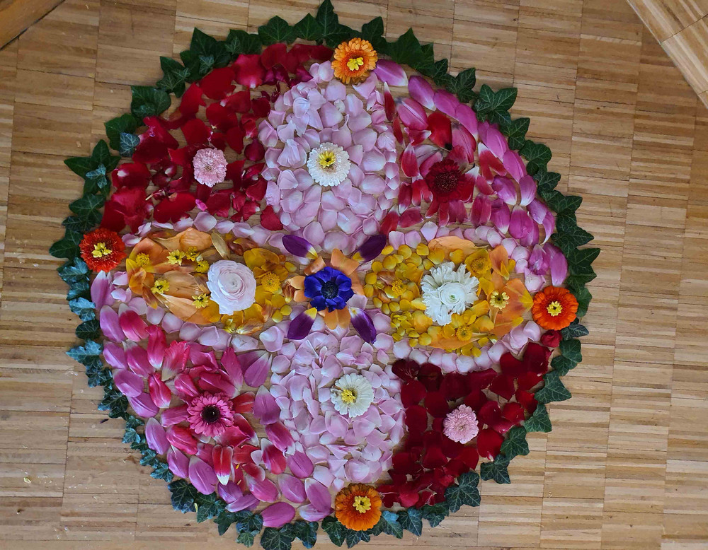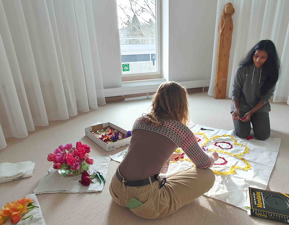 Im Unterkurs haben wir uns mit dem Thema Mandala beschäftigt. Wir hatten uns kritisch mit Ausmalmandalas auseinandergesetzt und sind dem kulturellen Ursprung des Mandalas im Hinduismus auf den Grund gegangen. Dabei haben wir verschiedene Mandalamalapparate erprobt, Spirographen verwendet, klassische Ausmalbilder ausgemalt und mit Materialien wie Blüten Mandalas gelegt. Anschließend setzten wir uns beim Herstellungsprozess mit dem kreativen Prozess nach Rudolf Seitz auseinander, um abzuklären, welche Methode das größte kreative Potential anregt. Im Stillen Zimmer hat ein zauberhaftes Blütenmandala unseren Tag der offenen Tür bereichert.
