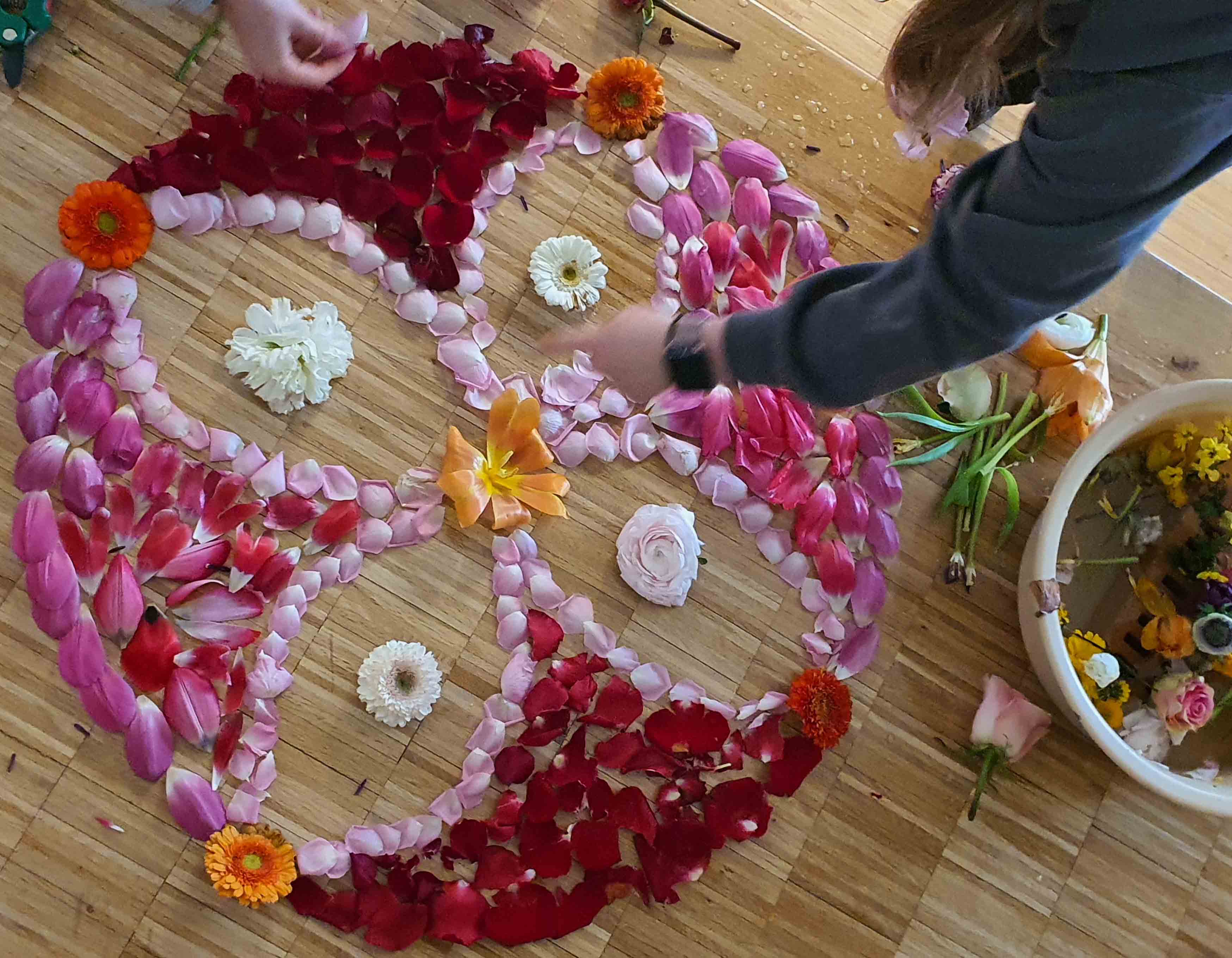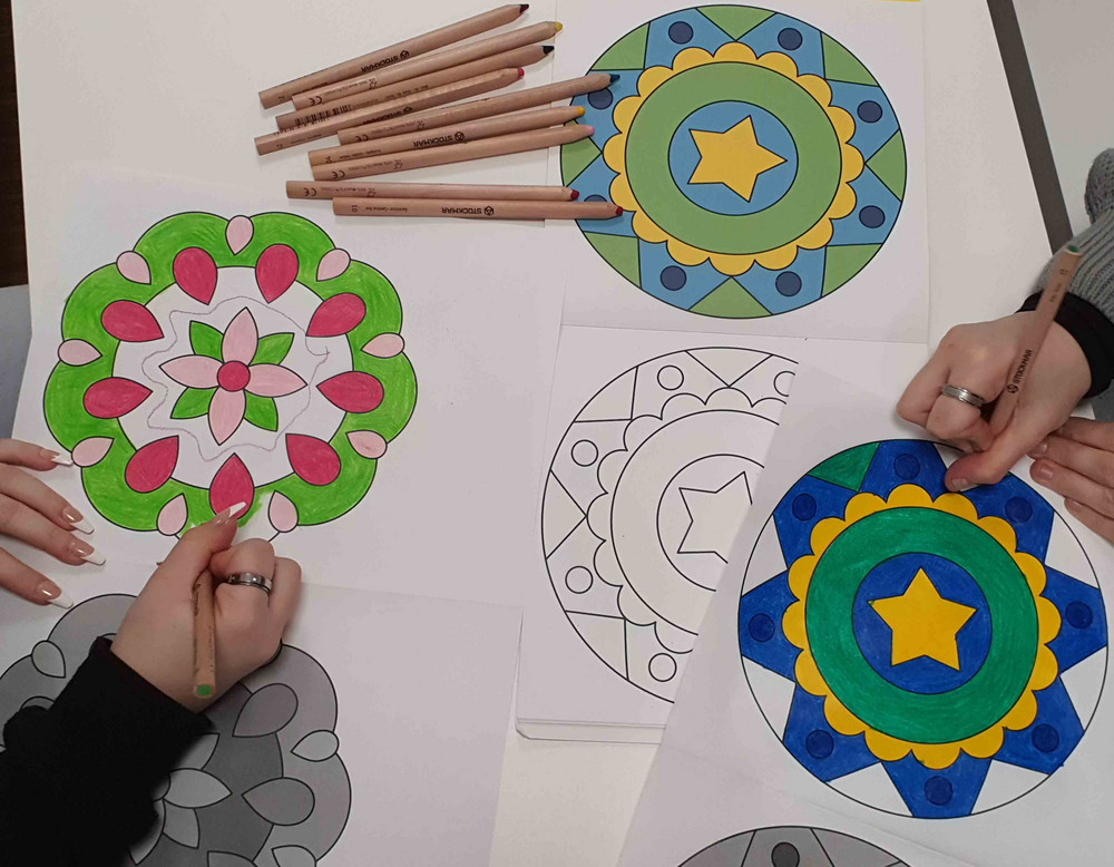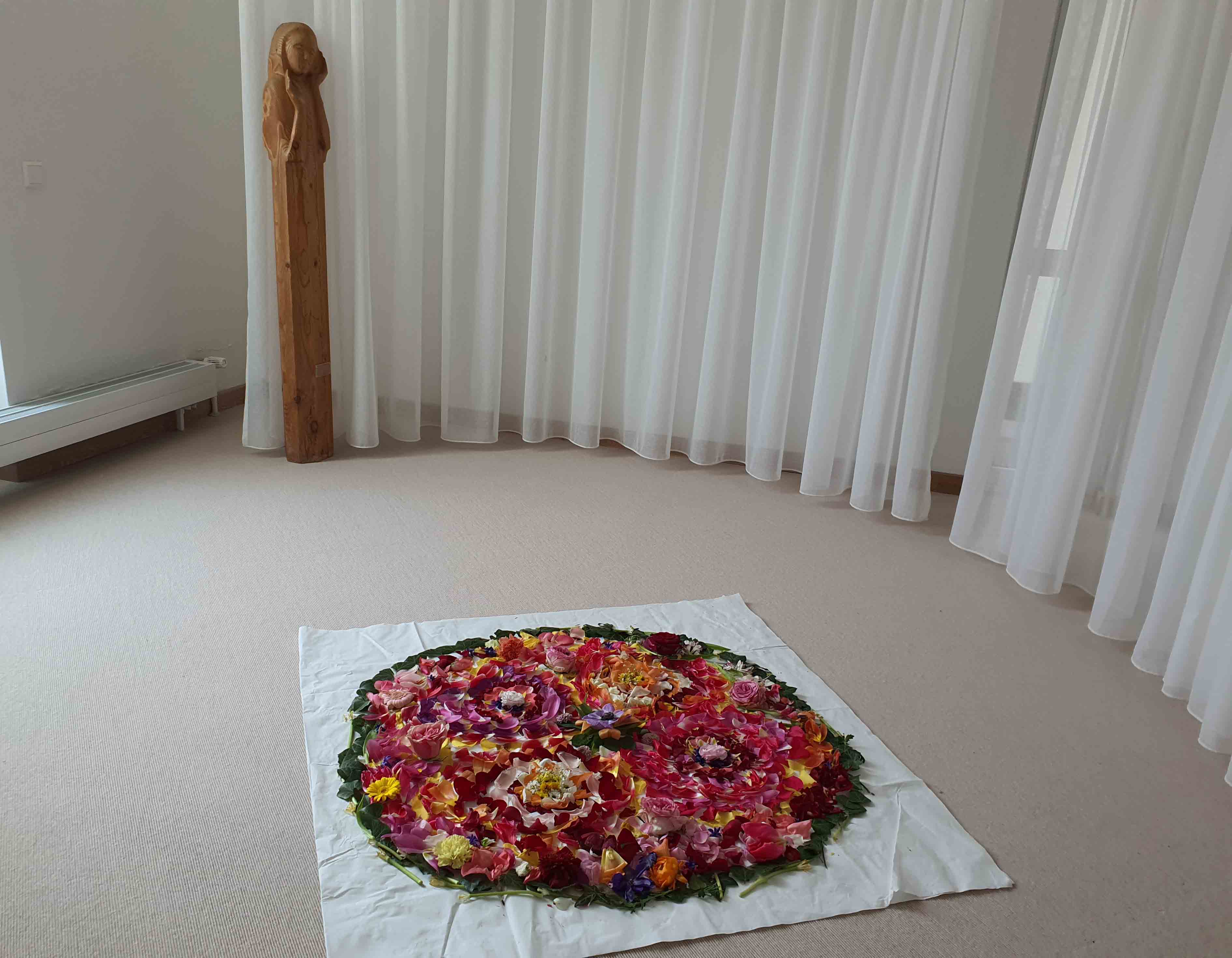 Im Unterkurs haben wir uns mit dem Thema Mandala beschäftigt. Wir hatten uns kritisch mit Ausmalmandalas auseinandergesetzt und sind dem kulturellen Ursprung des Mandalas im Hinduismus auf den Grund gegangen. Dabei haben wir verschiedene Mandalamalapparate erprobt, Spirographen verwendet, klassische Ausmalbilder ausgemalt und mit Materialien wie Blüten Mandalas gelegt. Anschließend setzten wir uns beim Herstellungsprozess mit dem kreativen Prozess nach Rudolf Seitz auseinander, um abzuklären, welche Methode das größte kreative Potential anregt. Im Stillen Zimmer hat ein zauberhaftes Blütenmandala unseren Tag der offenen Tür bereichert.