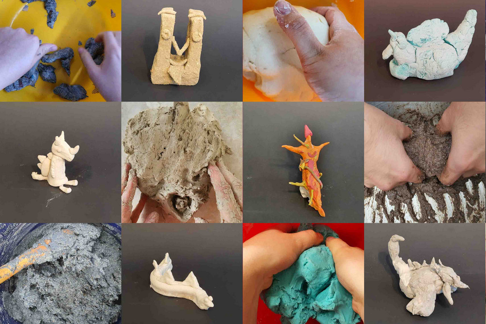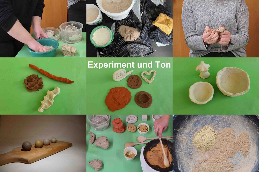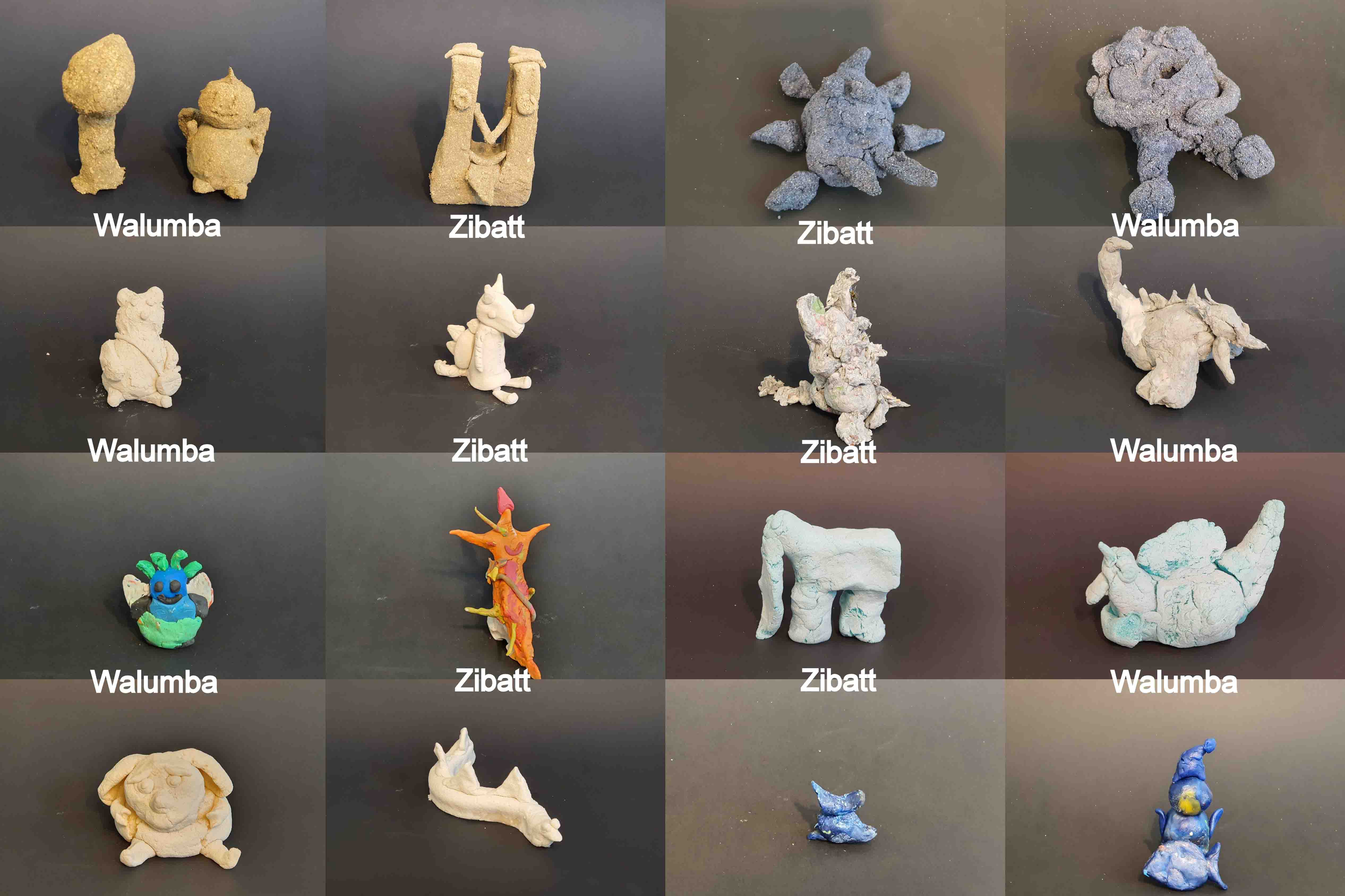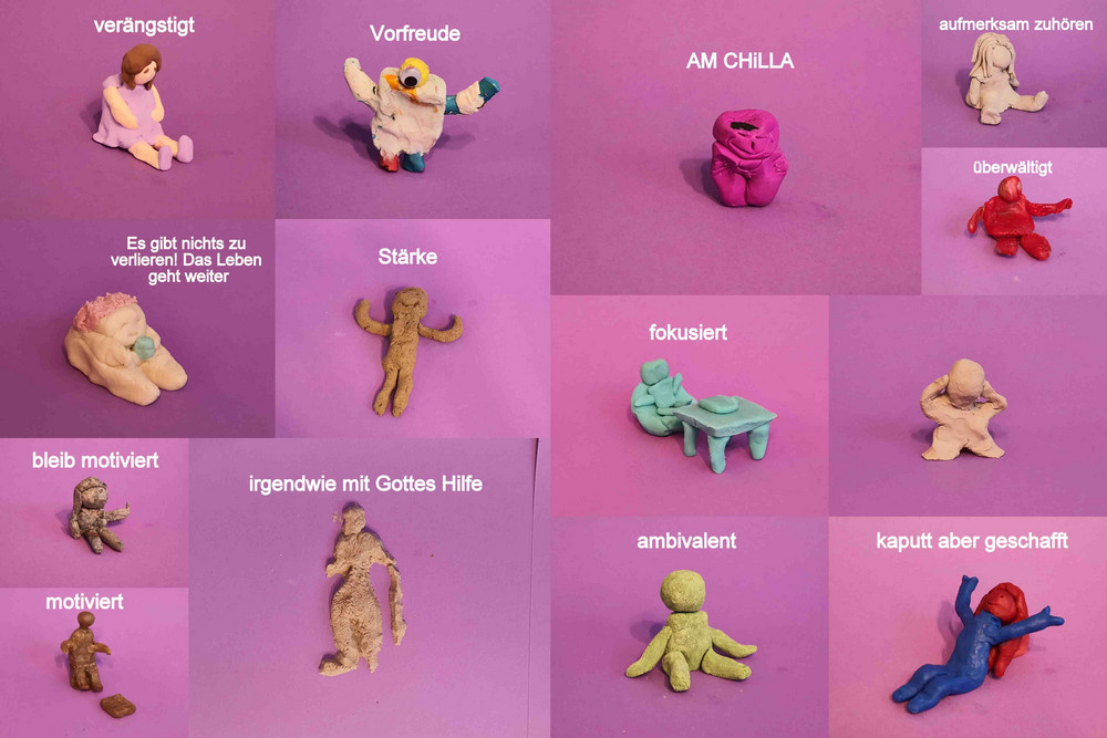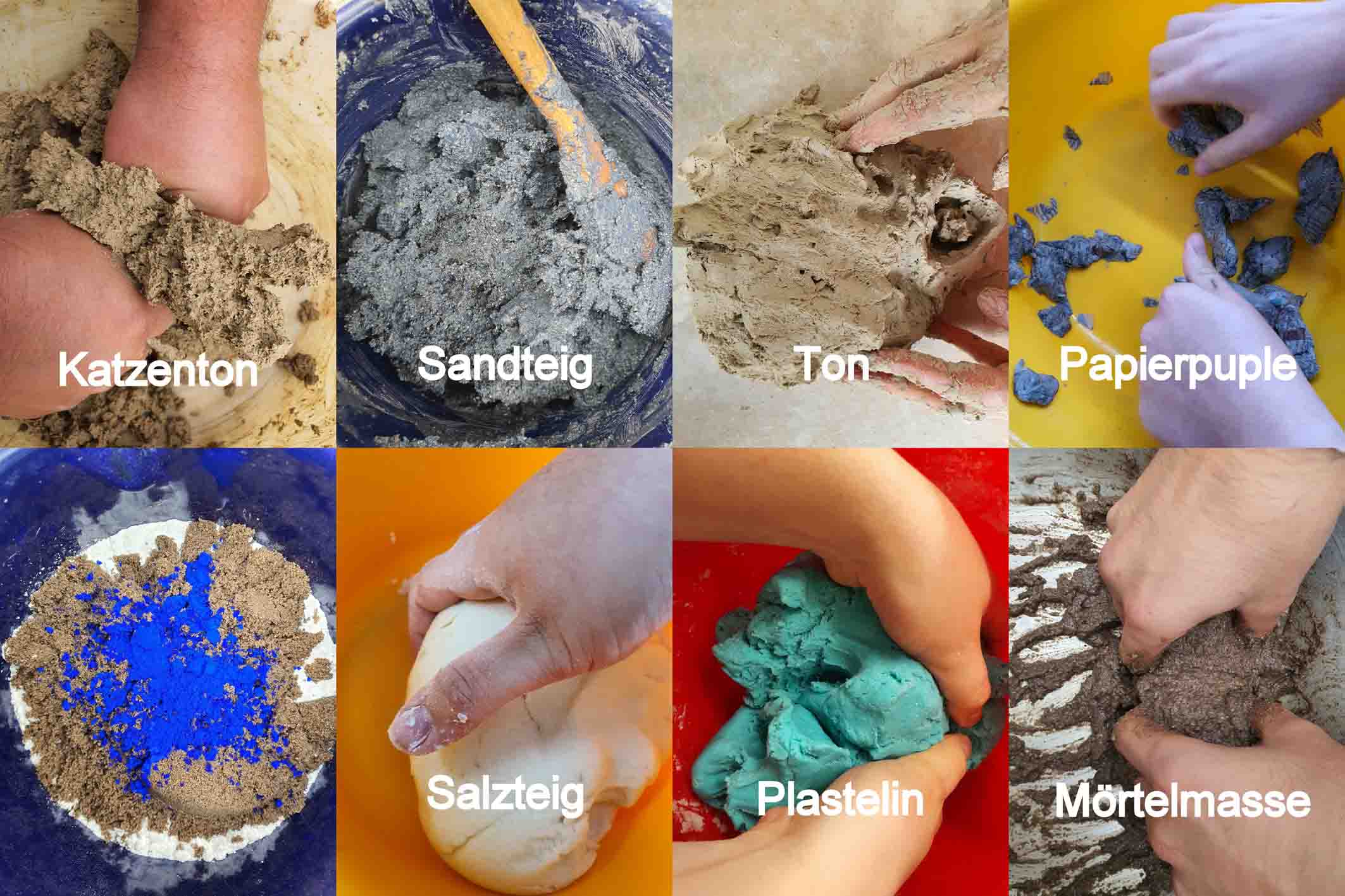 Aus Eierkartons und Zeitungspapier, aus Sand, mit Katzenstreu, aus Ton, aus Wachs und aus Salzteig wurden verschiedene Modelliermassen hergestellt. Anschließend modellierte der Oberkurs StellvertreterInnen, die die Haltung widerspiegeln sollte, mit der jeweils in die Abschlussklasse gestartet wird. Der Unterkurs versuchte den nicht näher definierten Charakteren „Walumba“ und „Zibatt“ eine dem Klang entsprechende Form zu geben.