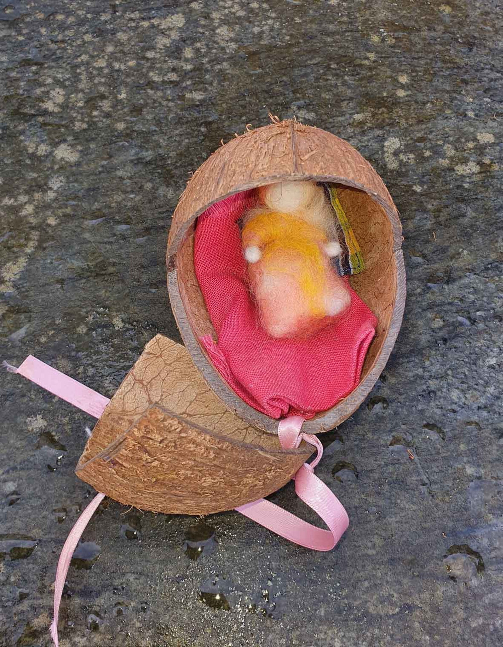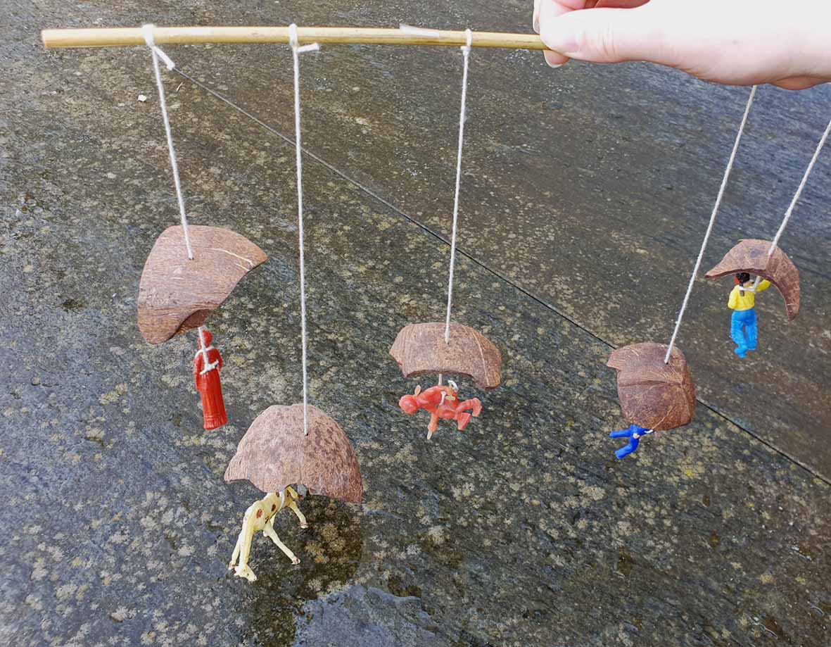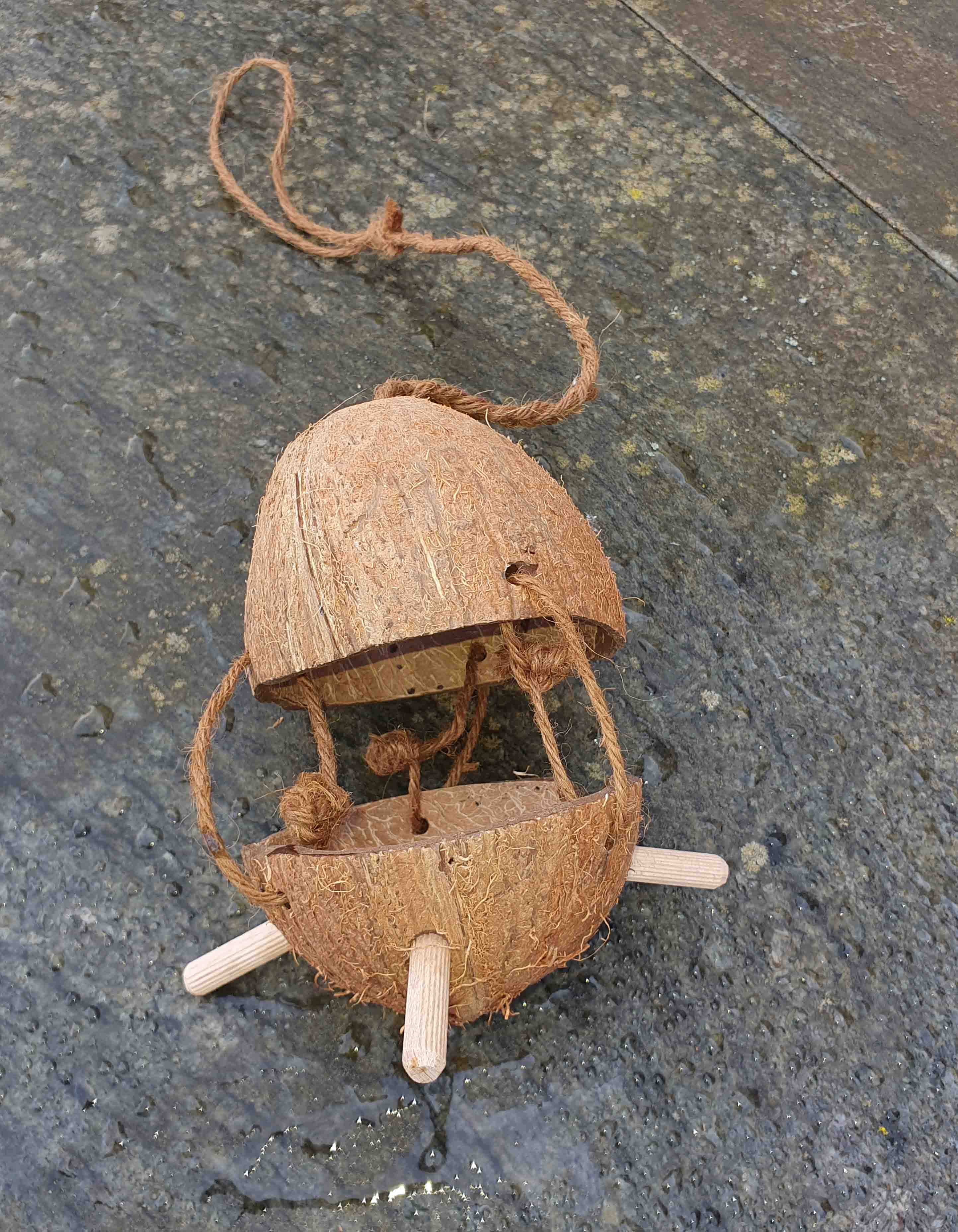 Entstanden ist ein leckerer Kokosnusskuchen, Kokosnusseiswürfelchen, Kokosjoghurt mit Kokoschips, Haarlotion, ein BH aus Kokosnussschalen, Schiffchen, Ohrschützer, Schmuck, Schlüsselanhänger, eine Puppenwiege, eine Versteckspielfigur, ein Püppchen, eine Rassel, ein Vogelhäuschen, ein Mobile, ein Teelichthalter und eine Trinkschale.