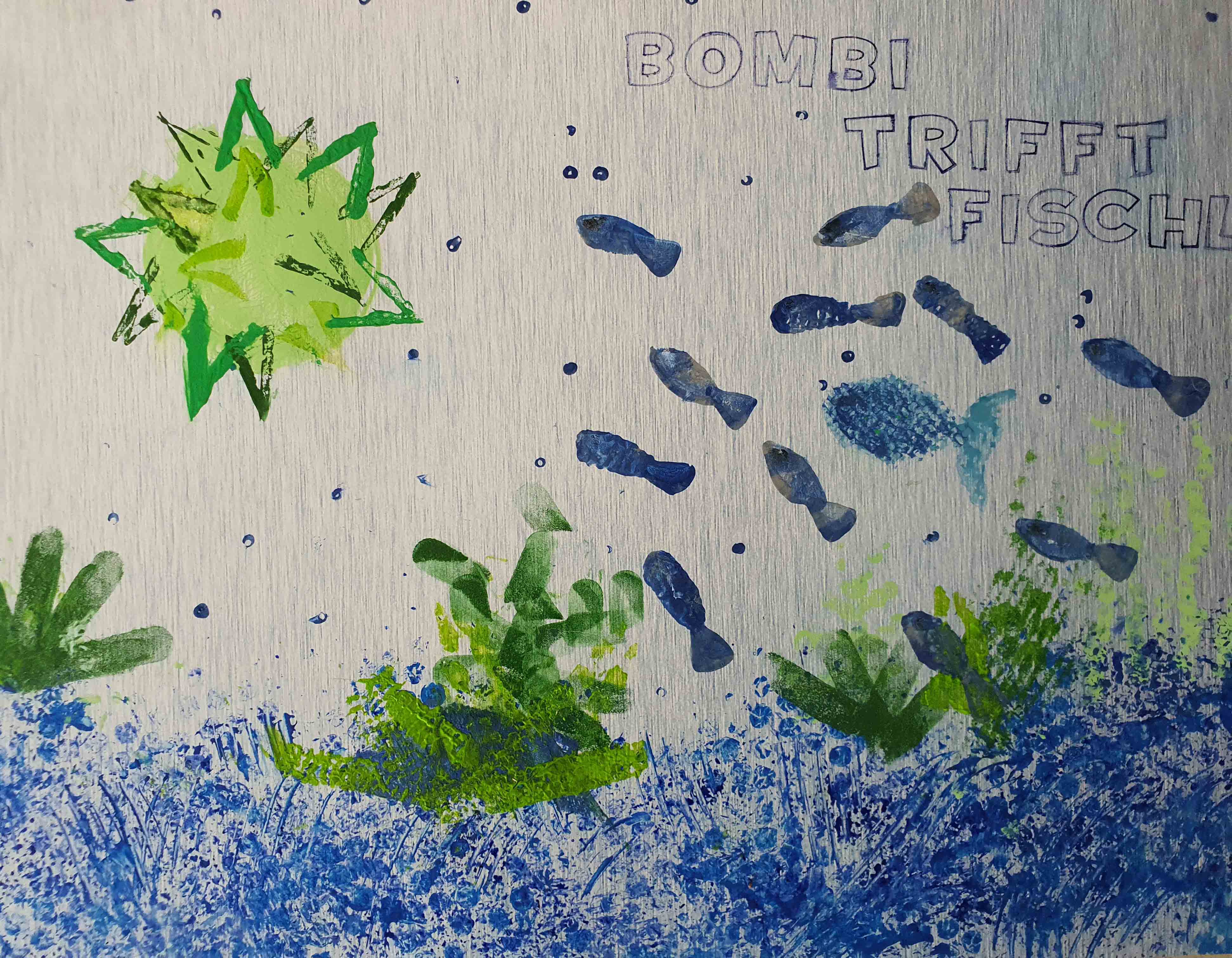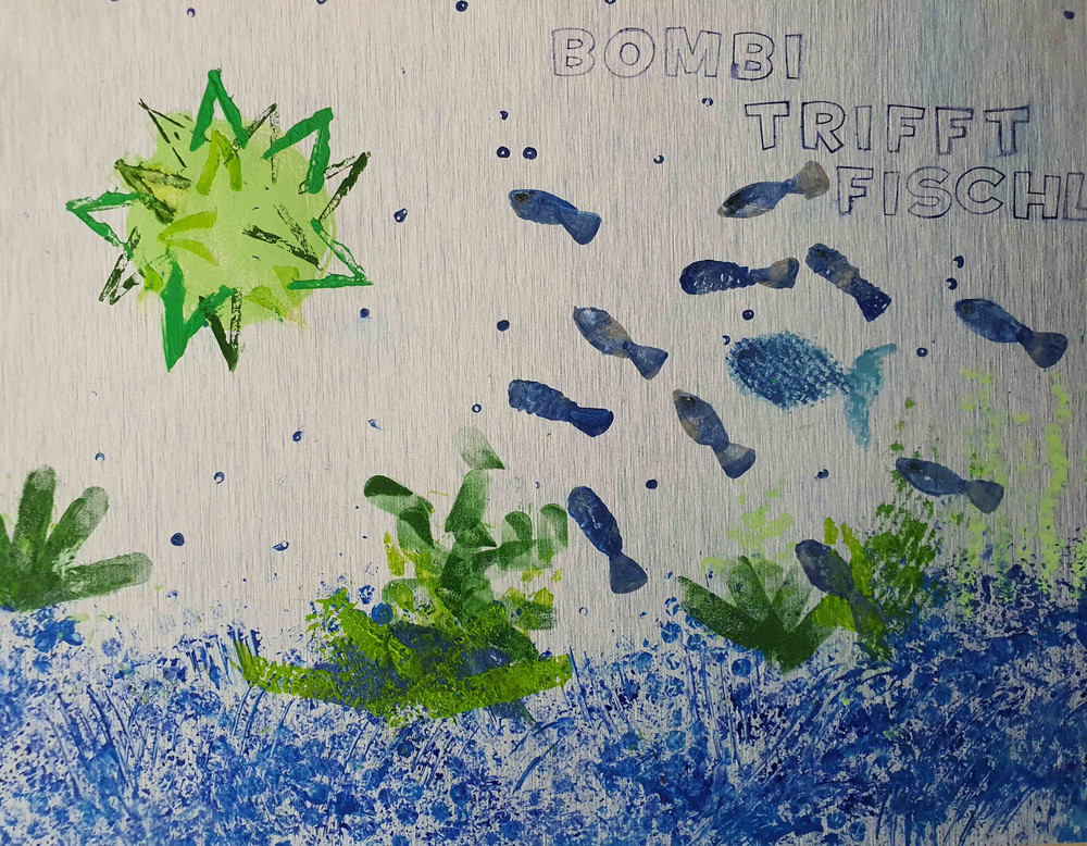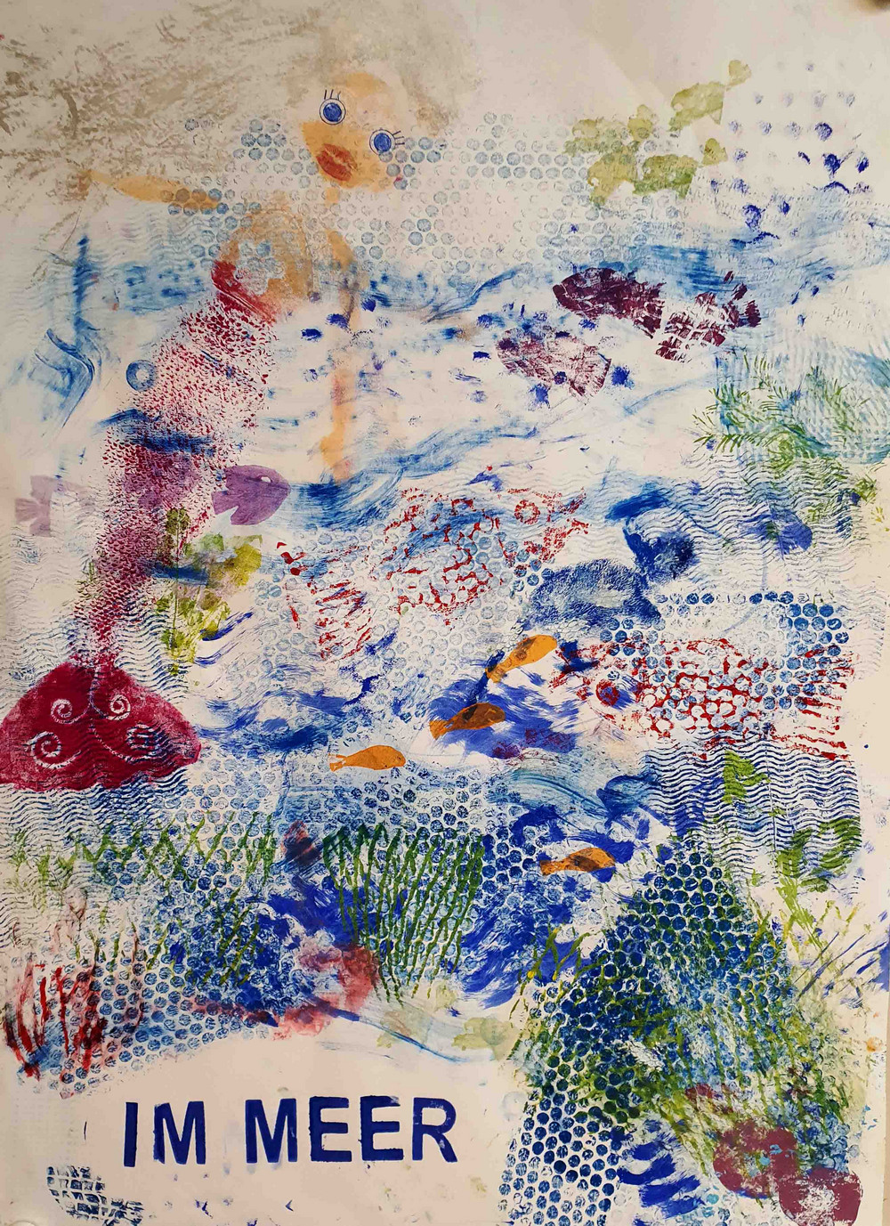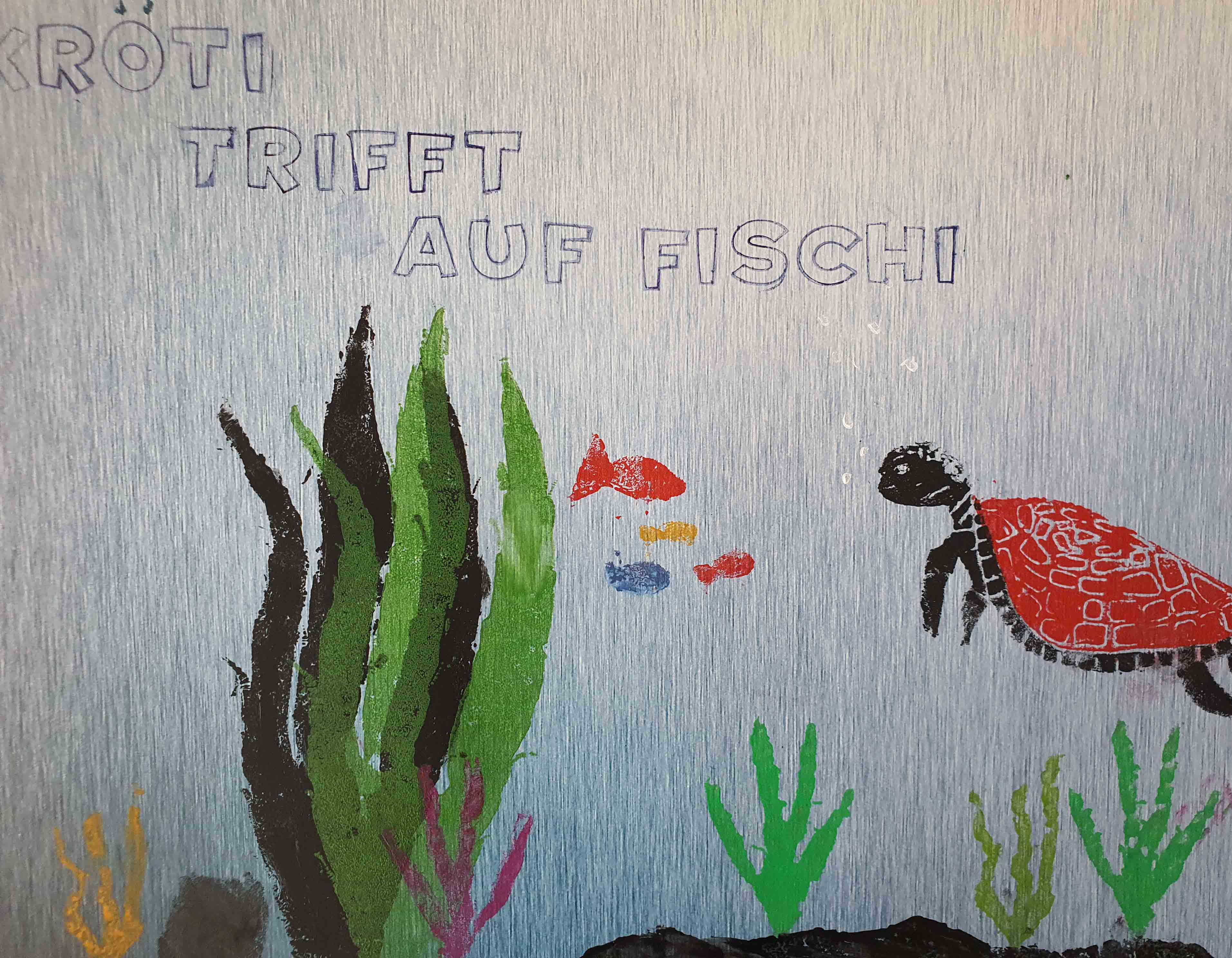 Bilderbücher sind bunt, genauso wie wir! In PiA 1a feiern wir die Vielfalt unserer Ideen, die uns der Zufall gebracht hat. Aus einem Klecks wird ein lachender Mond und aus einer gefalteten Malerei entsteht ein Dschungel. Oft ist es zu Beginn noch ungewiss, wohin uns der Zufall führt, und es erfordert etwas Mut und Geduld, sich ihm hinzugeben, aber am Ende entstanden viele verschiedene Bilderbuchseiten und der Zufall ist uns jetzt kein Unbekannter mehr.