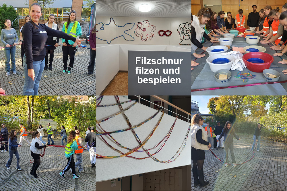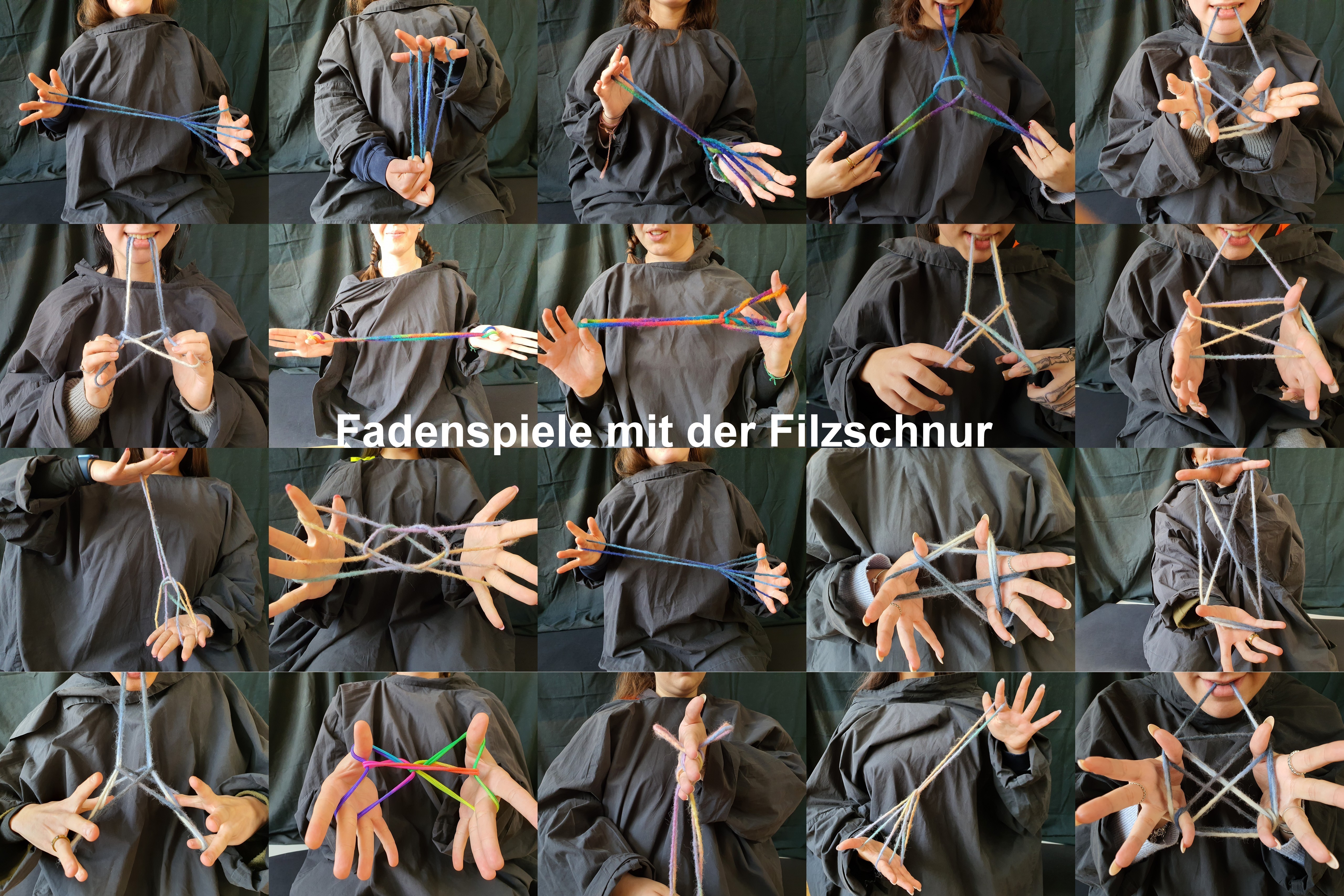 Im WPF BK hat die Gruppe zuerst mit Wolle eine große Schnur gefilzt. Diese wurde bespielt und an den Schulwänden entstand eine schöne Filzschnurgestaltung. Mit den kleinen Filzschnüren sind Fadenspiele für die sozialpädagogische Praxis eingeübt worden.