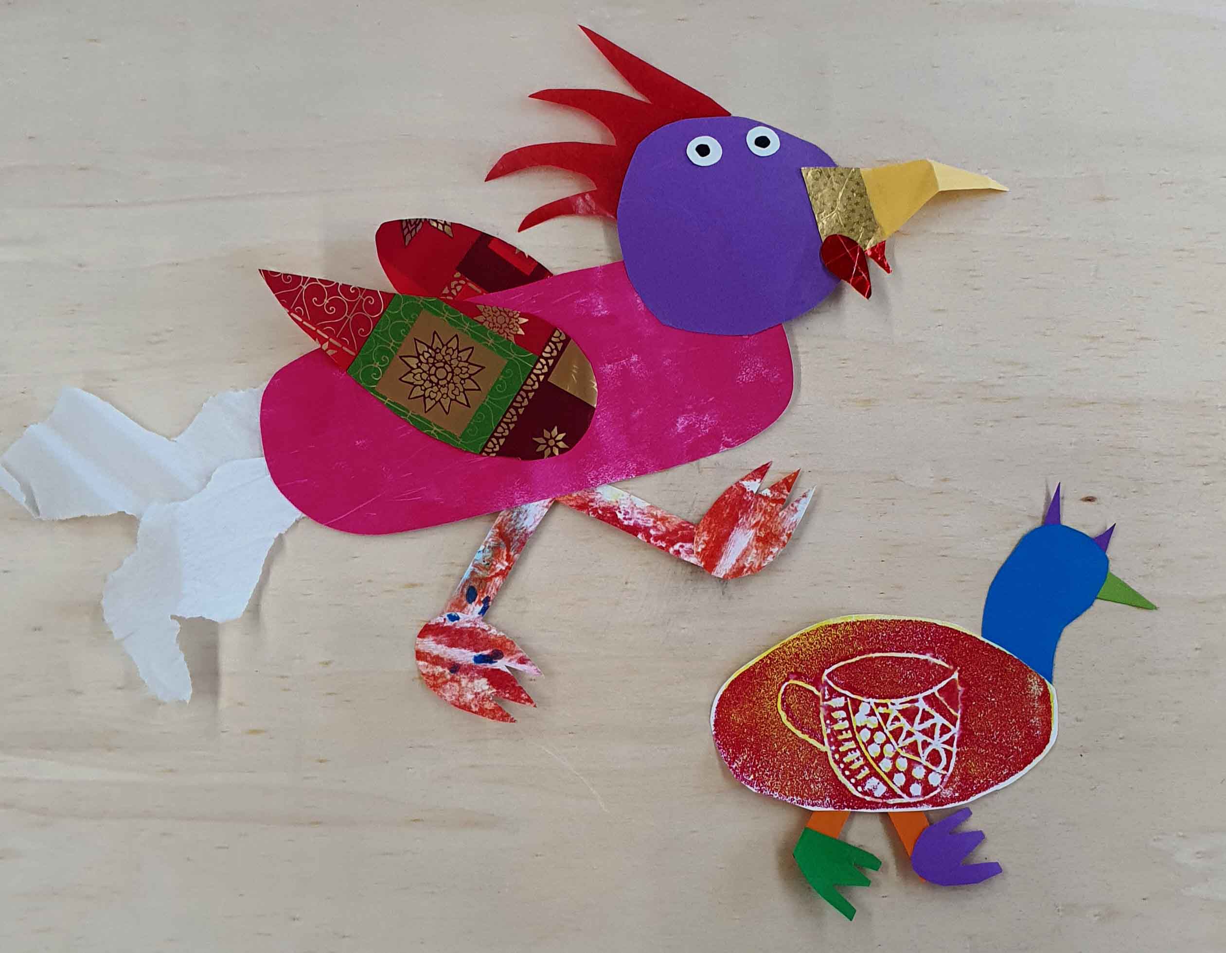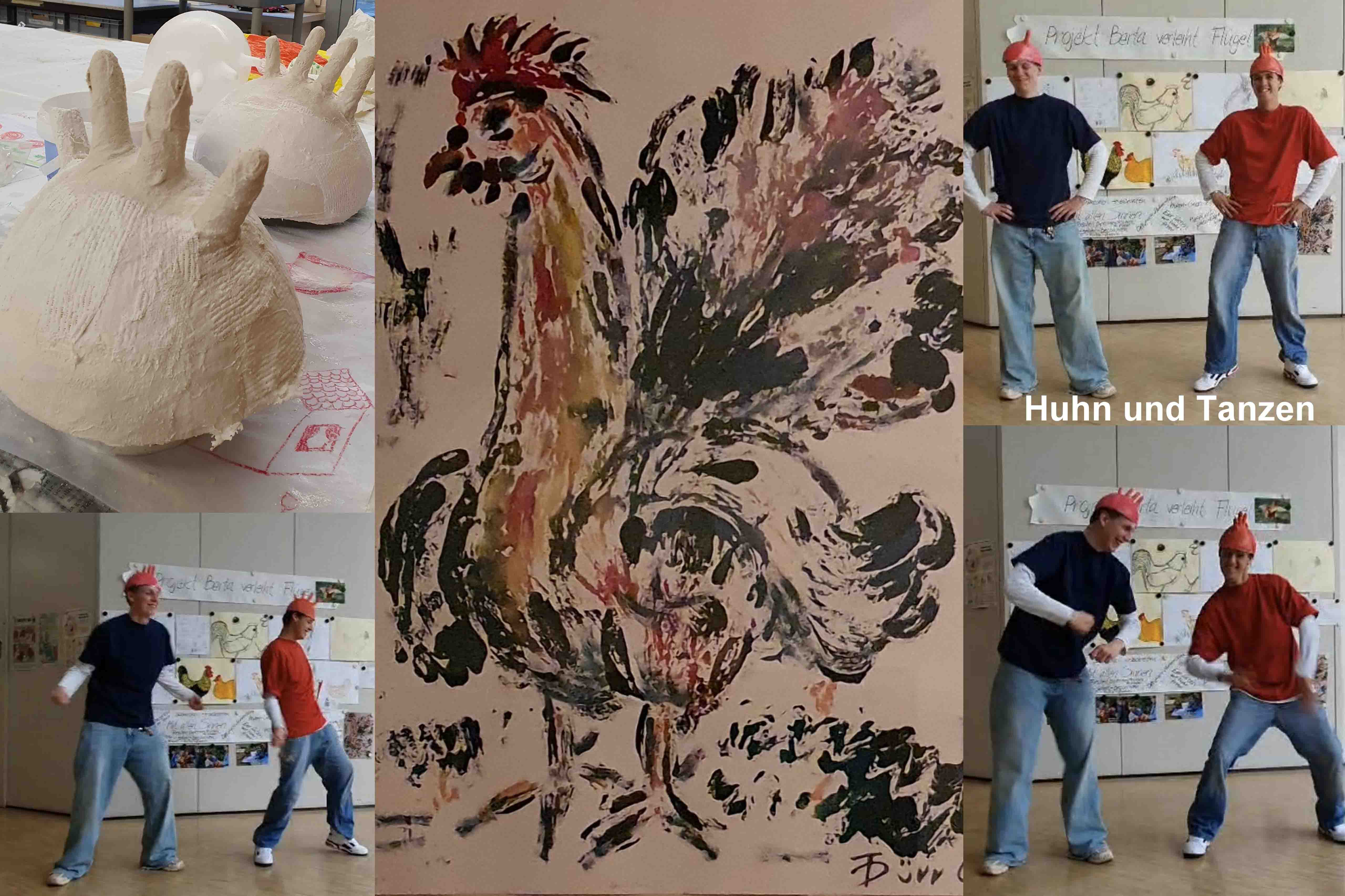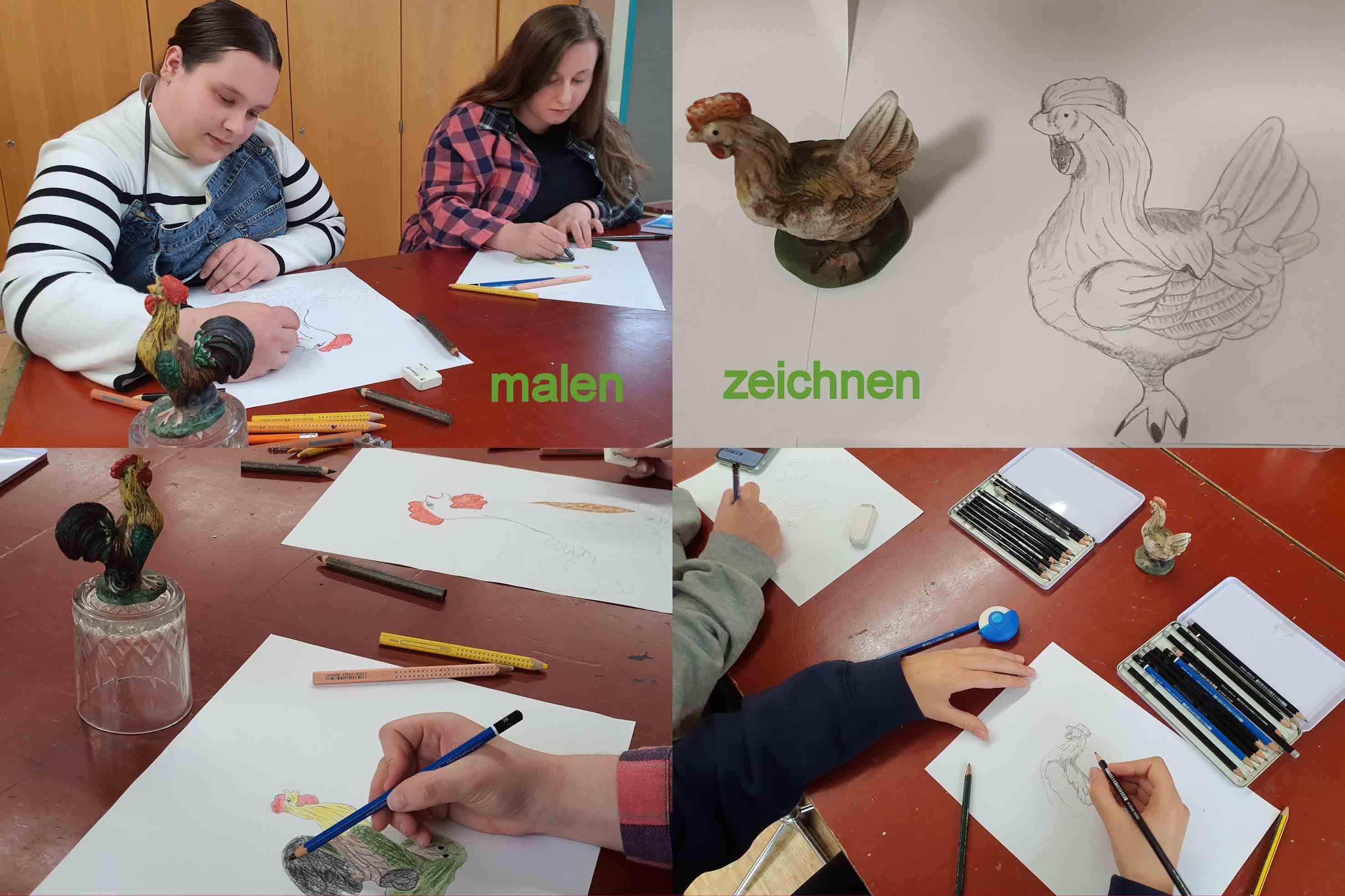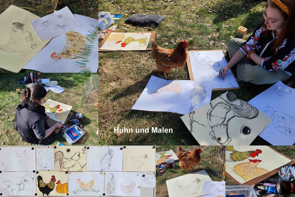 Mit verschiedenen Mal- und Zeichenmaterialien entstanden Malereien und Zeichnungen der Hühner. Auf Grund dieser Erfahrungen konnte leicht abgeleitet werden, welche Kompetenzen Kinder beim zweidimensionalen und beim dreidimensionalen Arbeiten brauchen. Schnell konnten die entwicklungsspezifischen Fähigkeiten den verschiedenen Altersstufen zugeteilt werden.
