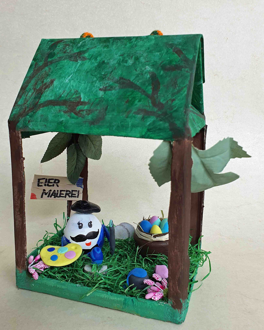 Der Unterkurs hatte um die Osterzeit die Aufgabe, die plastische Illustration eines Wortspiels mittels Modelliermasse und einem Ei umzusetzen. Alles reimt sich auf "ei": Liebelei, Loreley, Malerei, Polizei, Streiterei ...