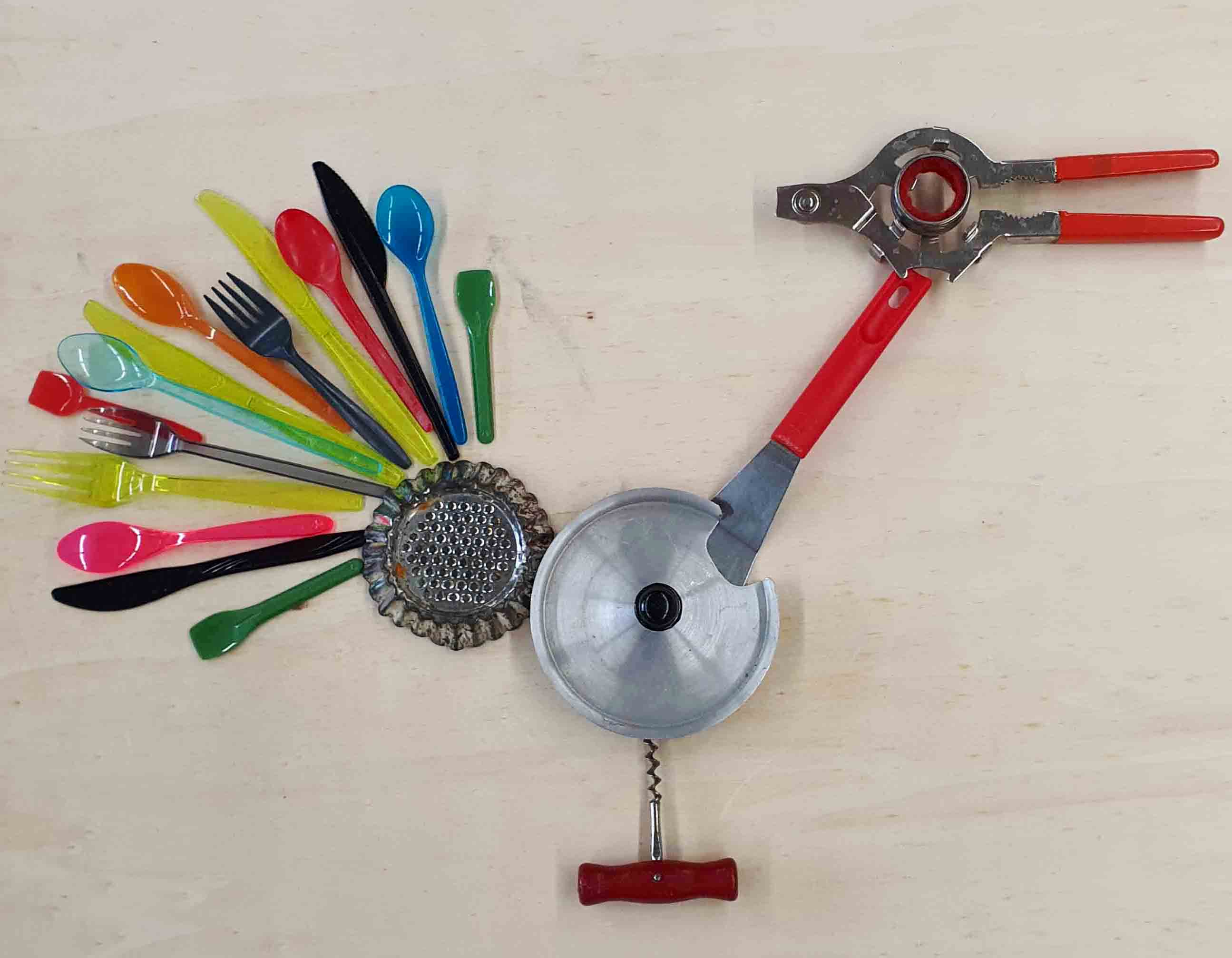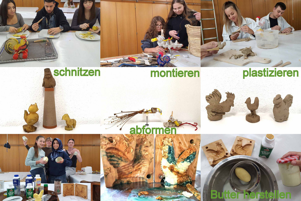 Die Oberkurse lernten in den ersten Stunden des neuen Schuljahrs die Begrifflichkeiten Skulptur, Plastik und Montage im dreidimensionalen Arbeiten kennen. Anhang von vier Huhnmodellen wurde das Huhn aus einer Kartoffel herausgeschnitzt, aus Ton plastiziert, aus Utensilien einer Küchenschublade zusammenmontiert und mit selbst geschlagener Butter abgeformt.