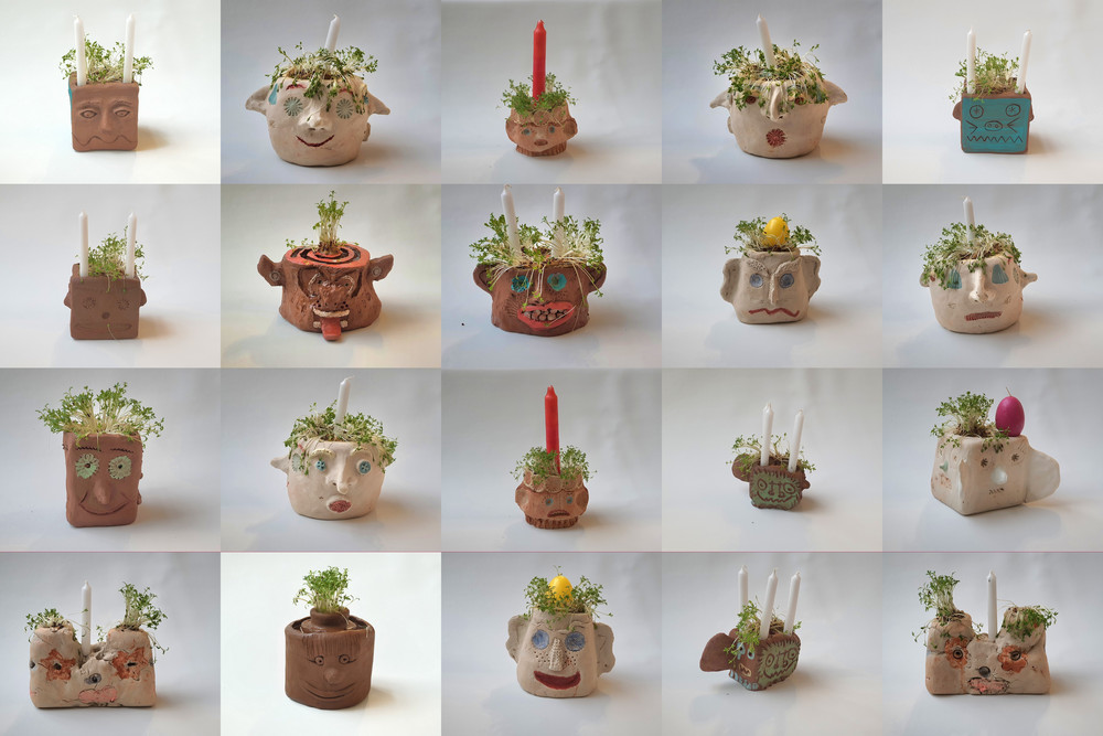 Der Unterkurs plastizierte heitere, phantasievoll gestaltete Köpfe. Mit verschiedensten Materialien wurden die Gesichter in Ton geprägt. Und um den Kreationen die Krone aufzusetzen, wächst ihnen eine Frisur aus Kresse, so dass sie sich Tag für Tag ein wenig verändern. Die kreativen Köpfe werden am Tag der offenen Tür in der Cafeteria die Tische schmücken und mit Kerzen eine schöne Stimmung erzeugen.