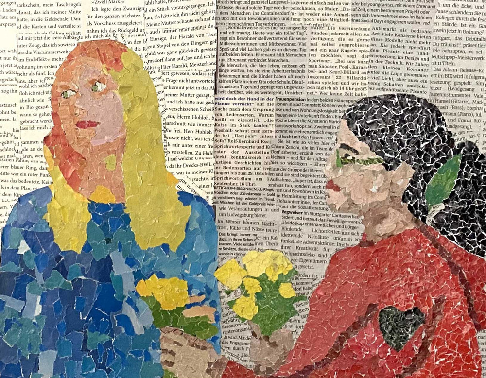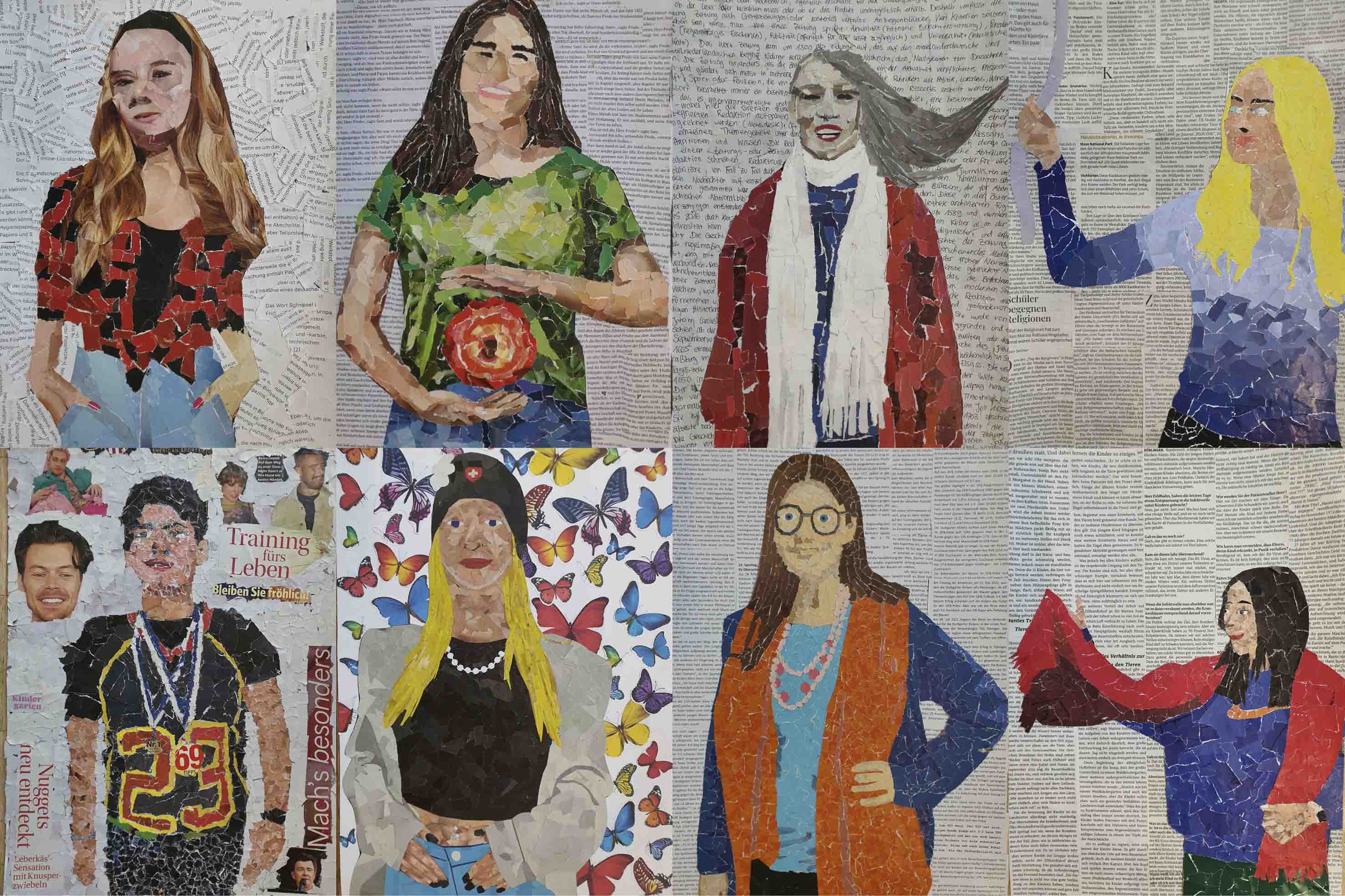 Ein Selbstporträt ist mehr als nur ein Abbild – es ist eine Auseinandersetzung mit der eigenen Identität. Unser neuer BK-Kurs begab sich auf die spannende Suche nach der eigenen Identität und der Beziehung, in der sie zueinander stehen. Nachdem wir uns im Teamteaching mit den verschiedenen Einsatzmöglichkeiten von Zeitungspapier auseinander gesetzt hatten, wurde das Thema „Papier“ in den Selbstporträts weitergeführt. Die Schülerinnen und Schüler porträtierten sich mithilfe der Collagetechnik. So entstanden ausdrucksstarke Arbeiten mit sehr viel Persönlichkeit.