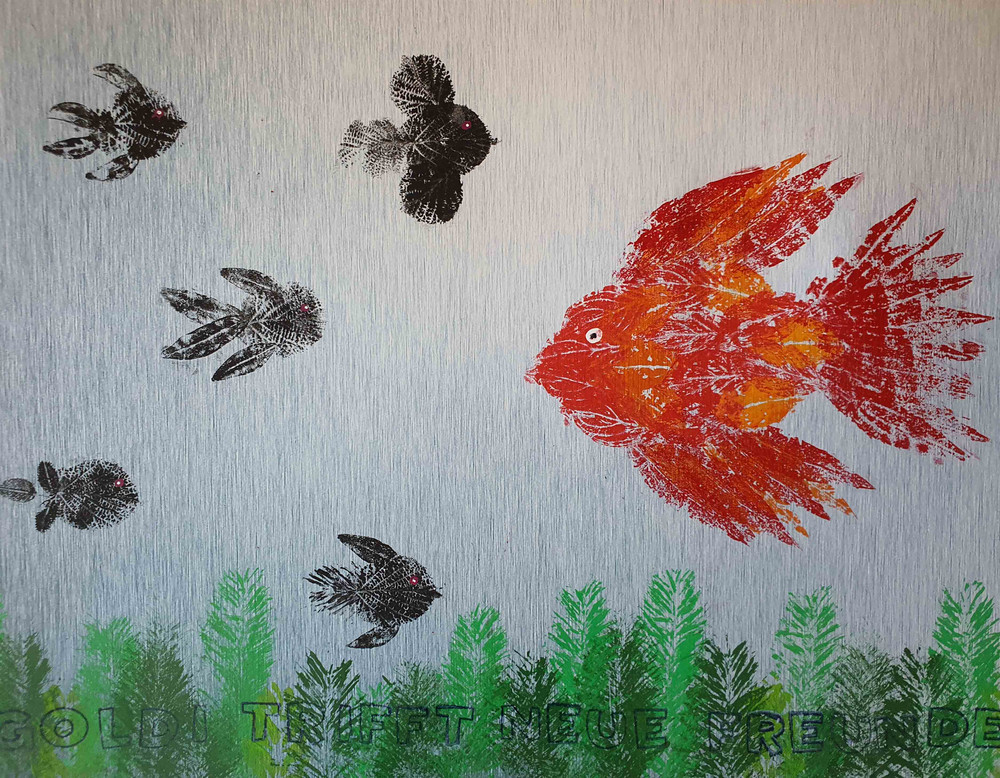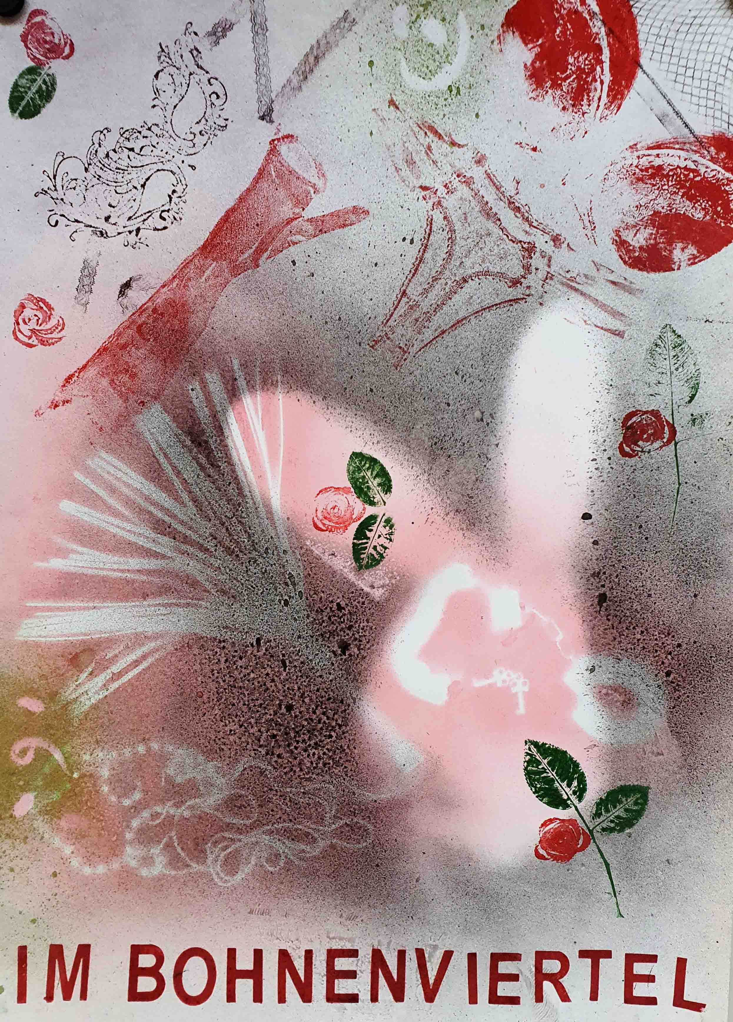 In unserem Druckprojekt (Körperdruck, Materialdruck, Plüschtierdruck, Stempeldruck, Kartoffeldruck, Siebdruck) im Unterkurs haben sich die Studierenden mit verschiedenem Ambiente und dessen Lokalkolorit beschäftigt, Vom Stuttgarter Bohnenviertel, dessen bitter arme Bewohnerschaft sich oft nur von den selbst angebauten Bohnen und in der jüngeren Vergangenheit anderen, gesellschaftlich nicht anerkannten Erwerbstätigkeiten ernähren konnte, über Bertas Hühnerhof mit seinen fröhlichen Geschehnissen, dem bedrohten Lebensraum Dschungel bis zu einem bunten Riff im Meer entstanden Freude bei der kreativen Tätigkeit und wunderschöne, bunte, lebendige Plakate.