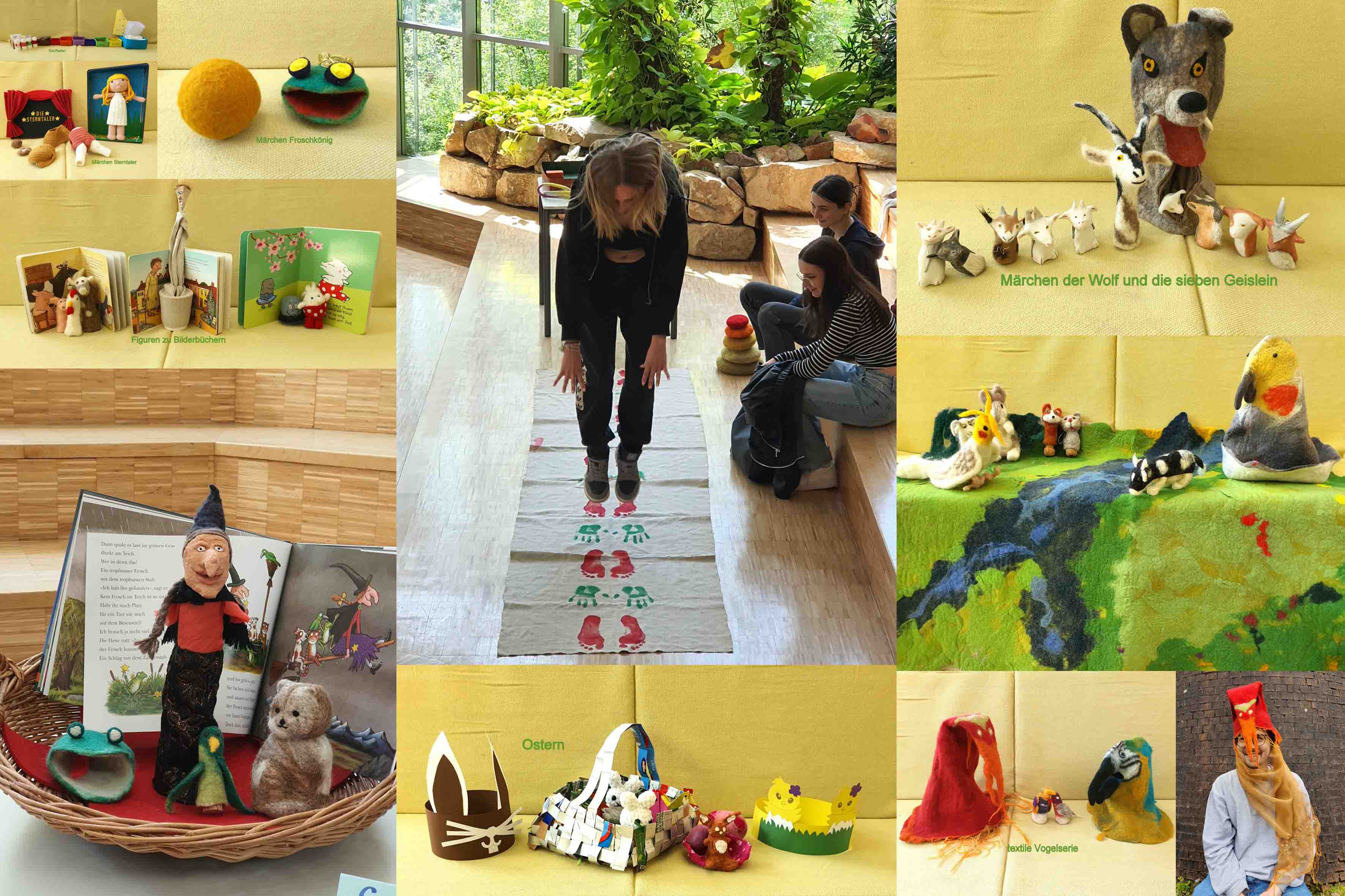 Die PiA-Kurse gestalteten im Wahlpflichtfach Spielfiguren und Spielobjekte zur Interaktion mit Kindern. In Gruppen wurden eigenständig Objekte aus ganz verschiedenen Materialien wie Papier, Naturmaterialien, Textil und Filz entwickelt. Die Spielfiguren und Spielobjekte finden bei den Kindern in der Praxis große Begeisterung.