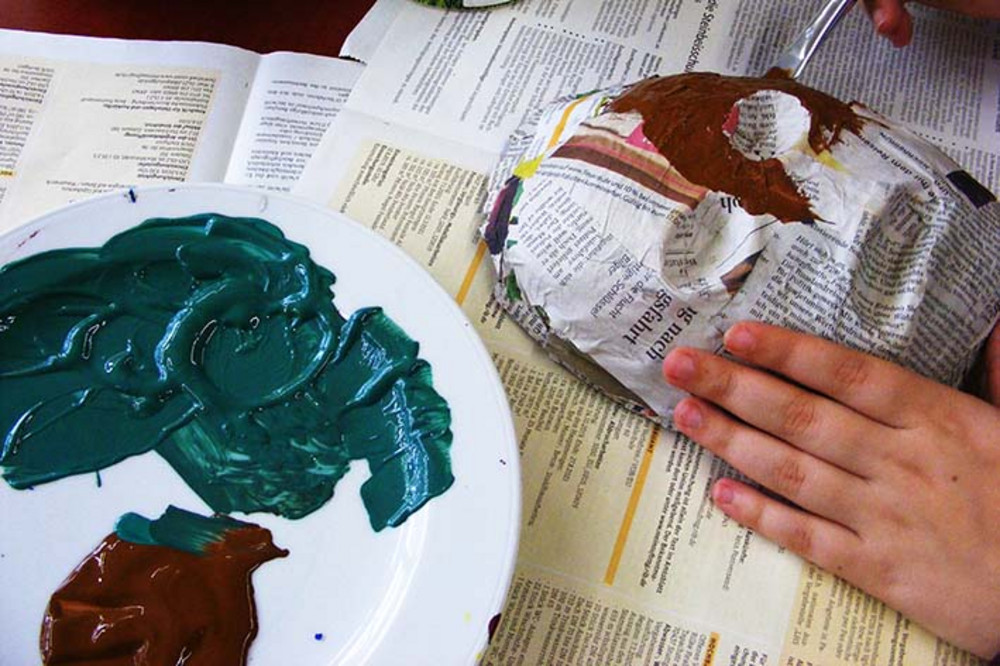 Unsere Masken sollten nicht nur von den afrikanischen Masken inspiriert sein. Unter dem Motto "Naturwesen" ließen wir uns von Farben und Formen der Natur anregen. Nach Übungen zu Farbmischungen und Naturstrukturen folgte die eigentliche Arbeit an den Masken: Aus Ton wurden die Modelle geformt und mit mehreren Lagen Papier kaschiert. So entstanden sehr leichte Masken, die anschließend bemalt und ausgestaltet werden konnten.