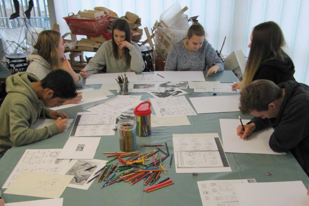 Aus den beiden Unterkursen besuchten 16 Studierende die Ausstellung "Graphic Novels. Aktuelle deutsche Comic-Romane" in der Galerie Stihl in Waiblingen. Bei einer Führung erfuhren wir einiges über die Entstehung dieses noch recht jungen Genres in der Kunst. Vor allem aber staunten wir über die unterschiedlichen Stile und Inhalte, bewunderten die teils großformatigen und doch fast fotorealistischen Bleistiftzeichnungen neben fantasievollen, malerisch-zarten Arbeiten und kontrastreichen Tuschebildern aktueller Künstler und Künstlerinnen.