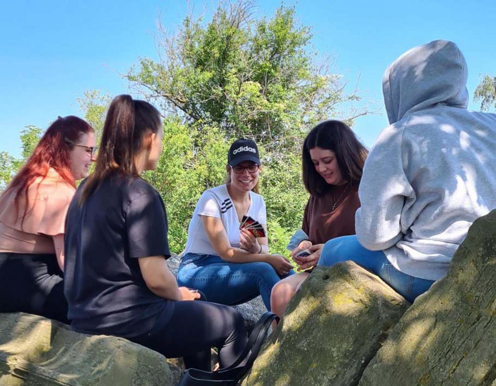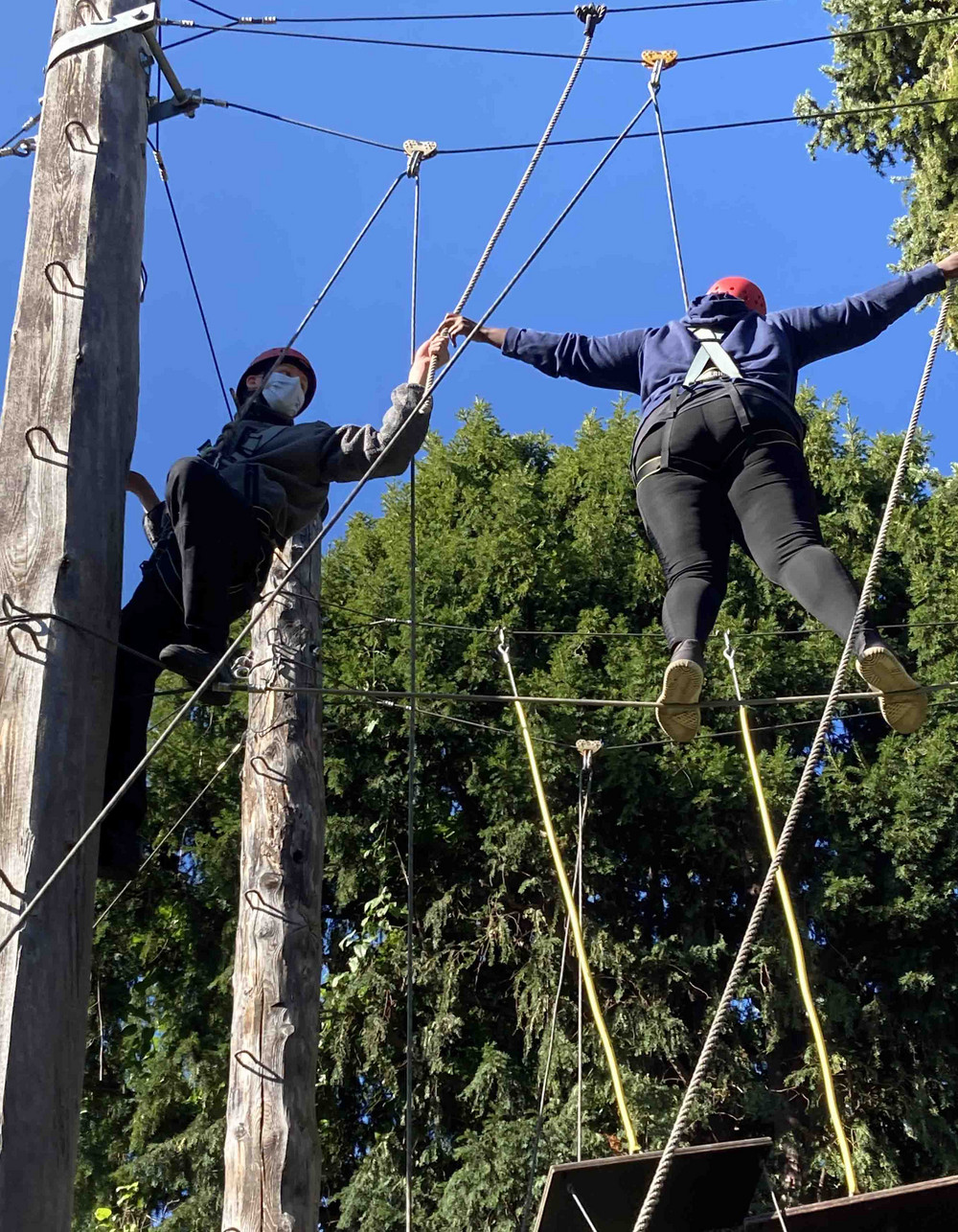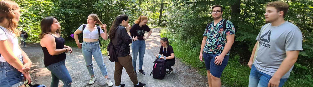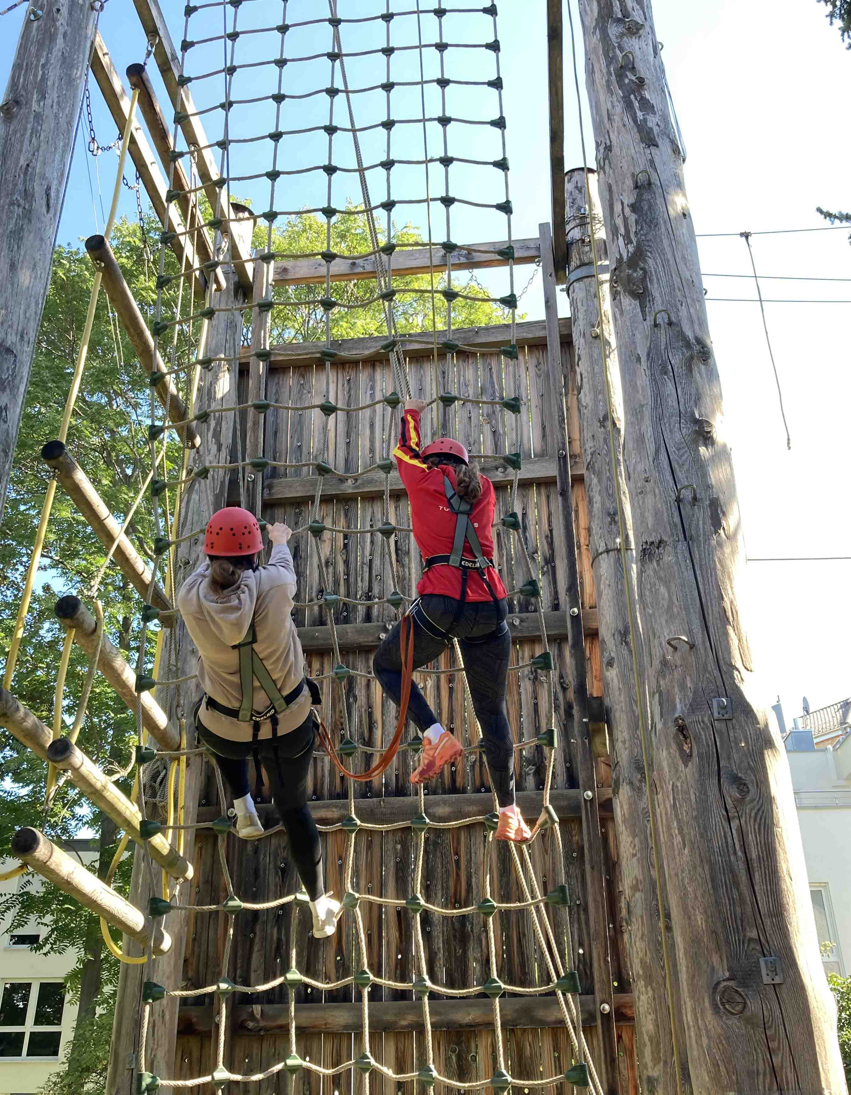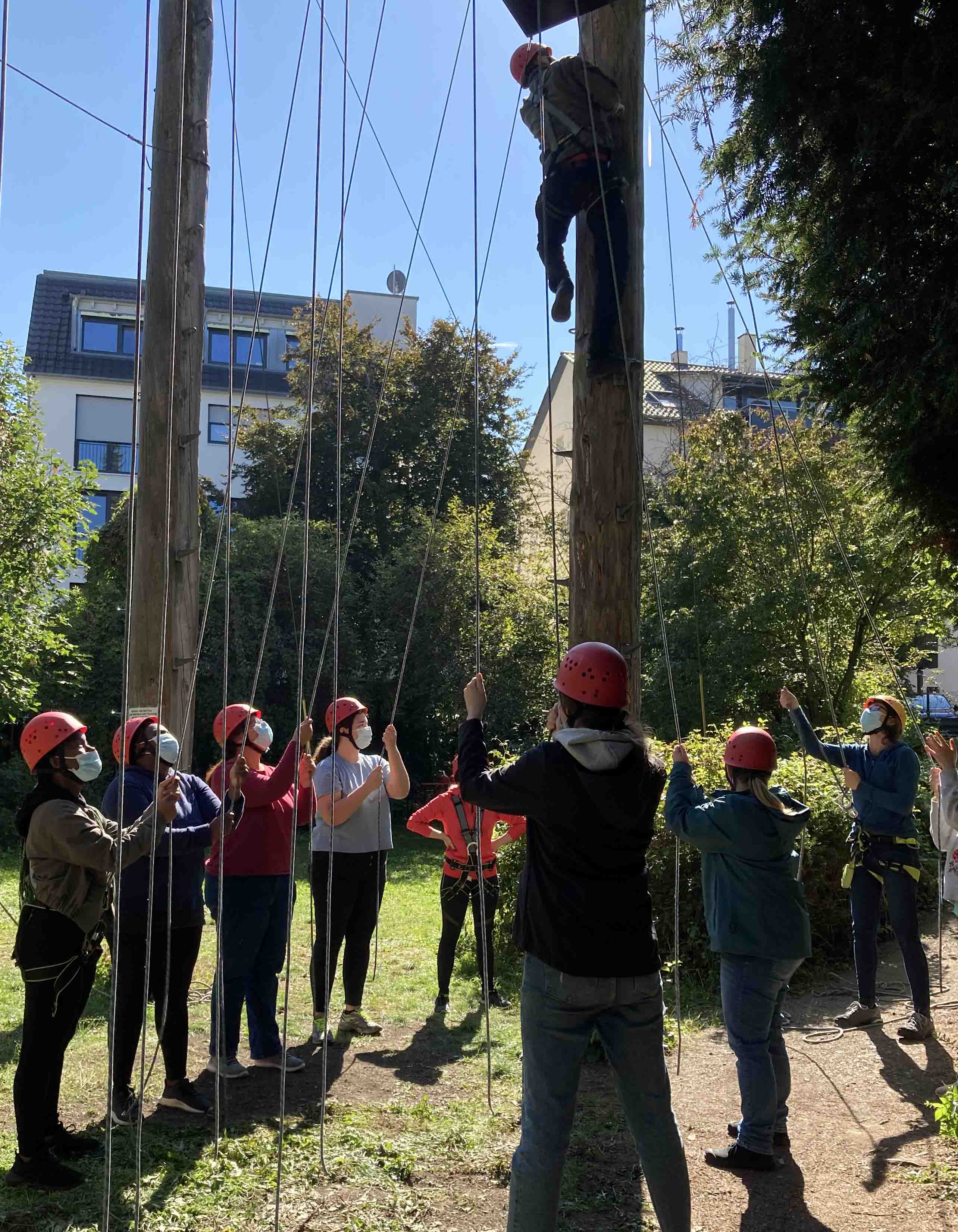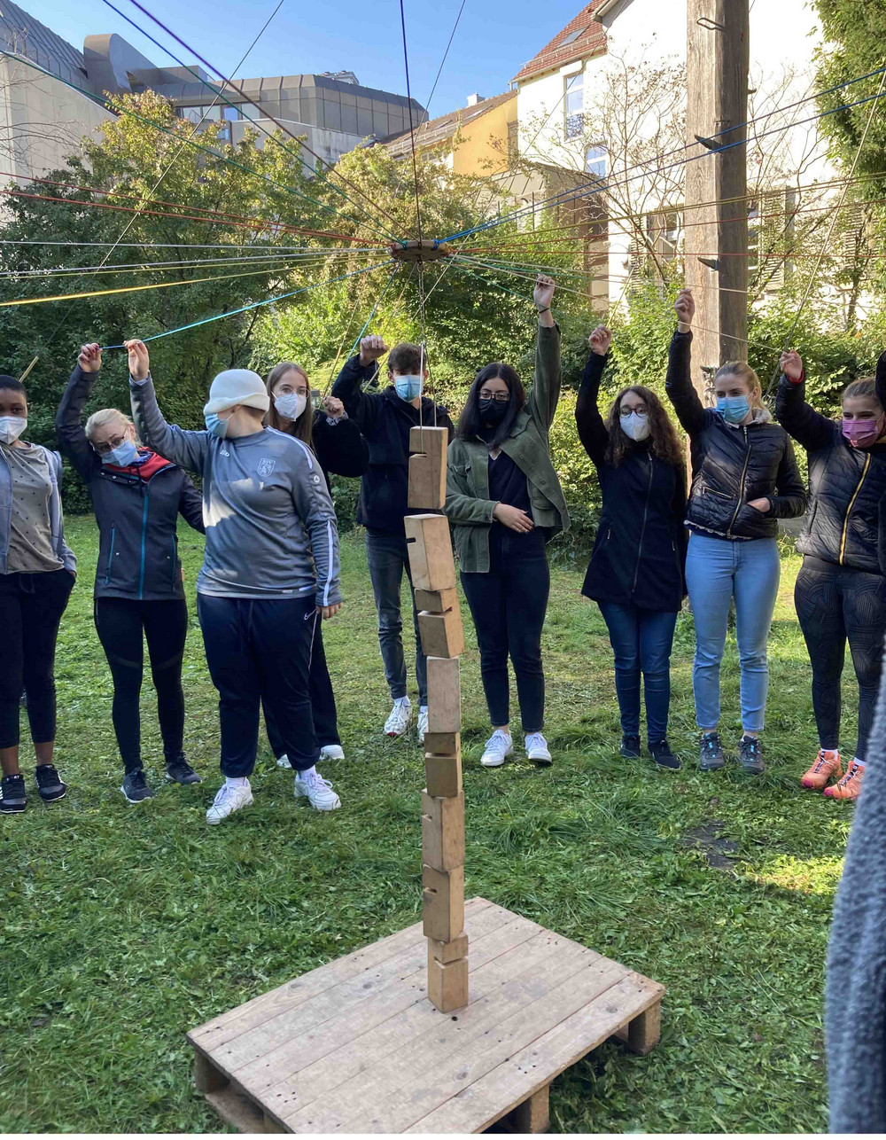 Die PiA1a-Klasse begann ihre Ausbildung mit einer Exkursion in einen kleinen, aber feinen Hochseilgarten der Evangelischen Jugend mitten in Bad Cannstatt: Kennen lernen durch gemeinsames Handeln, bei dem Freude am Spielen und an der Bewegung garantiert waren. Unter der Anleitung von drei erfahrenen Trainerinnen hatte die Klasse zunächst drei verschiedene Teamaufgaben am Boden zu lösen: So bildeten alle eine Reihe, um zwei Kugeln mit Hilfe verschieden breiter Rollelemente in einen Eimer zu bugsieren. Allerdings: Wie löst man diese Aufgabe, wenn die Reihe zwangsläufig zu kurz ist?