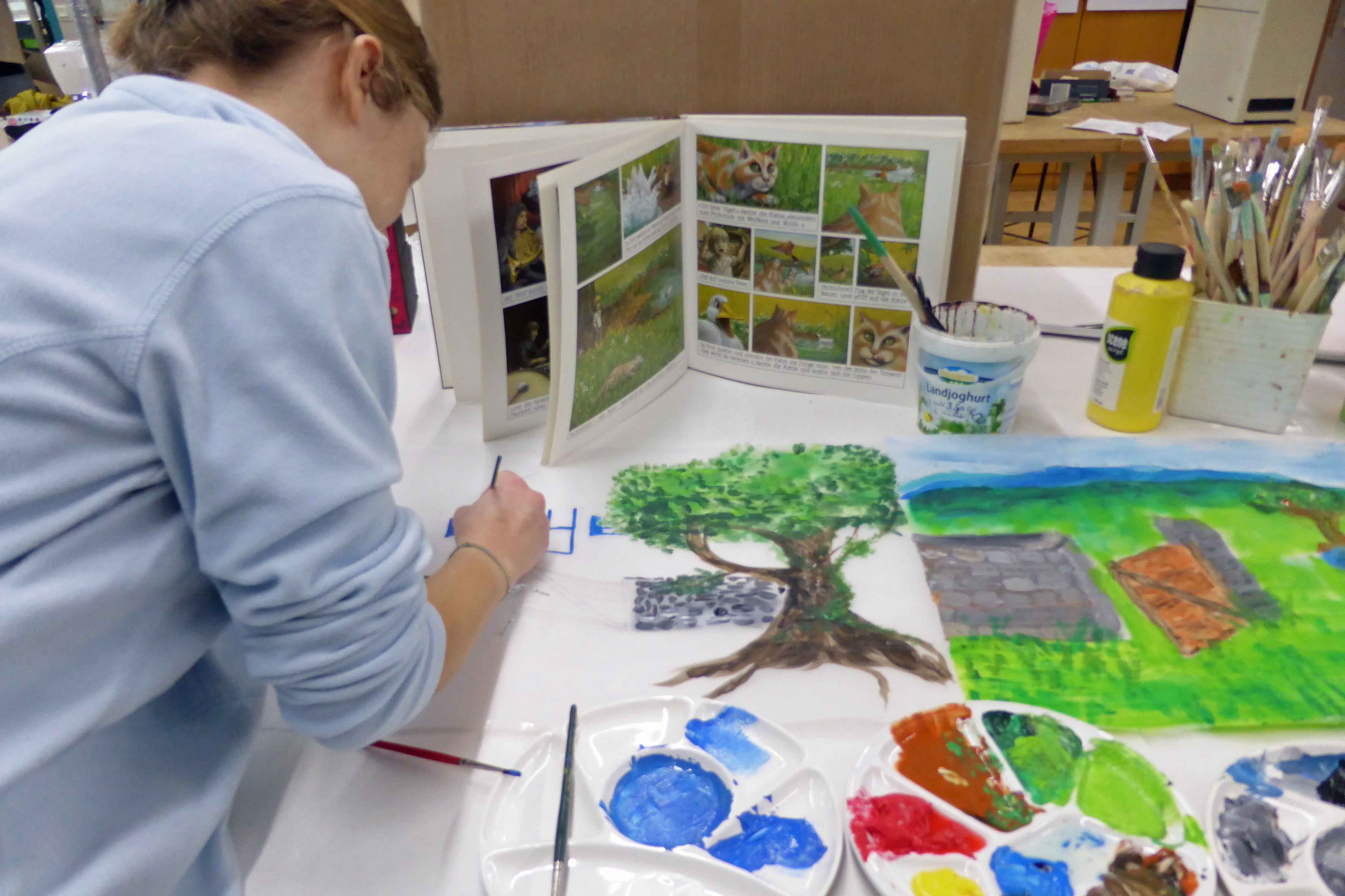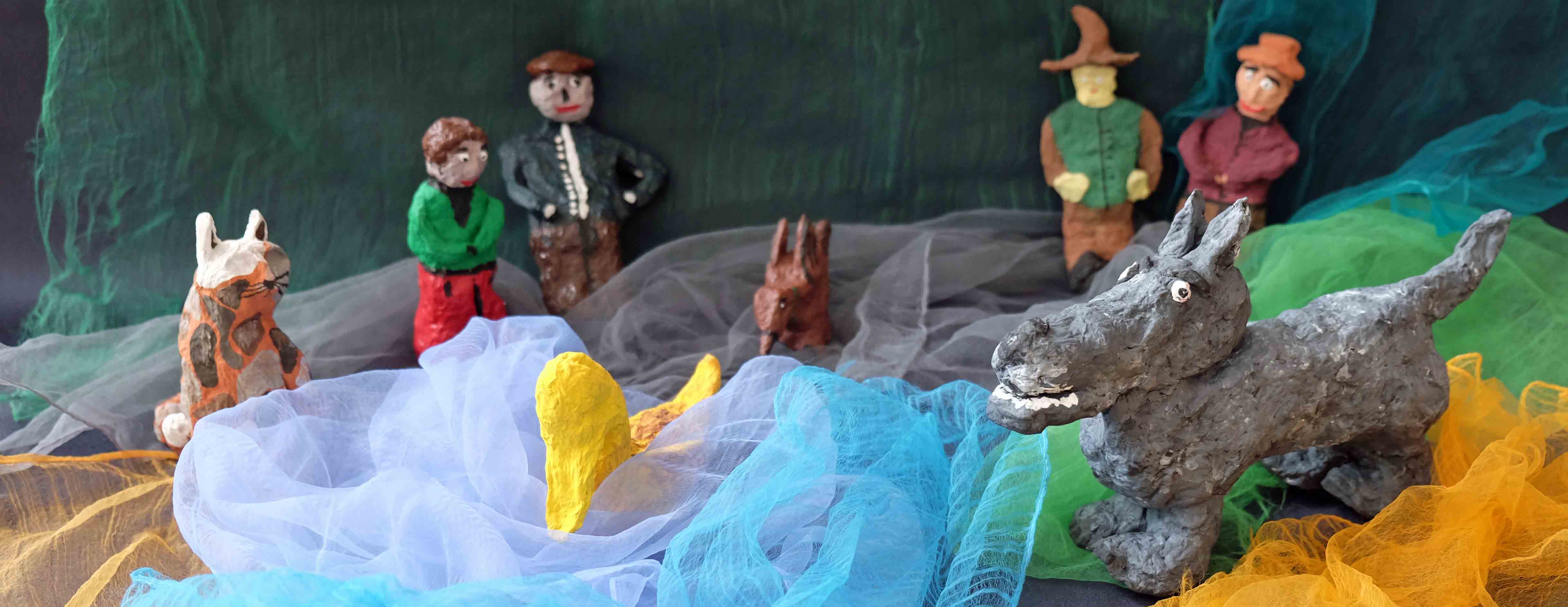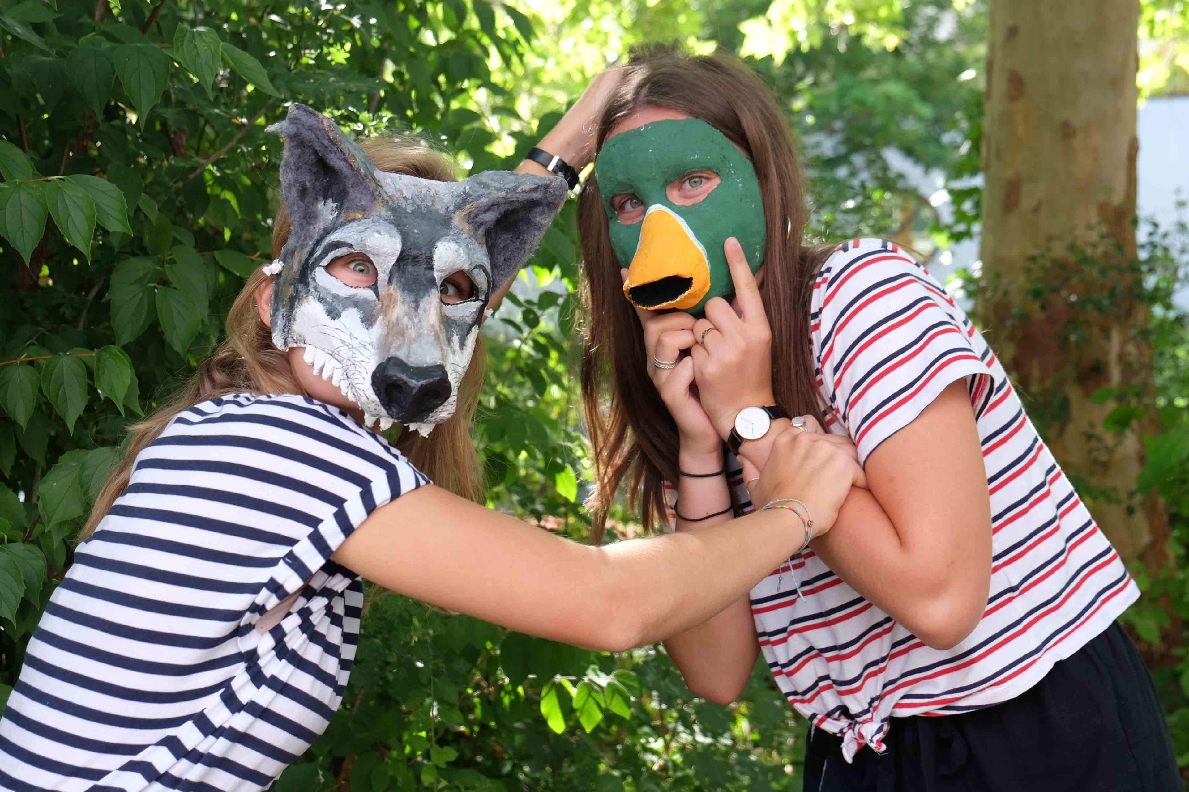 Der Unterkurs hat sich gemeinsam mit dem Spitalwaldkindergarten mit dem Musikstück „Peter und der Wolf“ von Sergei S. Prokofjew beschäftigt. Zuerst wurde im Unterricht in Gruppenarbeit das Stück in verschiedenen gestalterischen Varianten umgesetzt, wie zum Beispiel Masken, Spielfiguren aus Papiermache, Daumenkino, Fotostory. Die Kinder im Spitalwaldkindergarten haben sich zeichnerisch mit dem Musikstück auseinandergesetzt, unterstützt von einer Musikpädagogin. Unsere Ergebnisse werden von den Kindern ab dem kommenden Herbst im Kindergarten aufgegriffen und integriert. Durch Corona konnte das Stück im Sommer 2020 leider nicht wie geplant im Nachbarschaftsgarten aufgeführt werden. Da der Nachbarschaftsgarten die optimale Bühne darstellt, hoffen wir, dass dies noch zu einem späteren Zeitpunkt nachgeholt werden kann und sich die Kooperation mit Wolfgang Zaumseil und dem Spitalwaldkindergarten, die seit 1998 besteht, weiterhin bewährt.