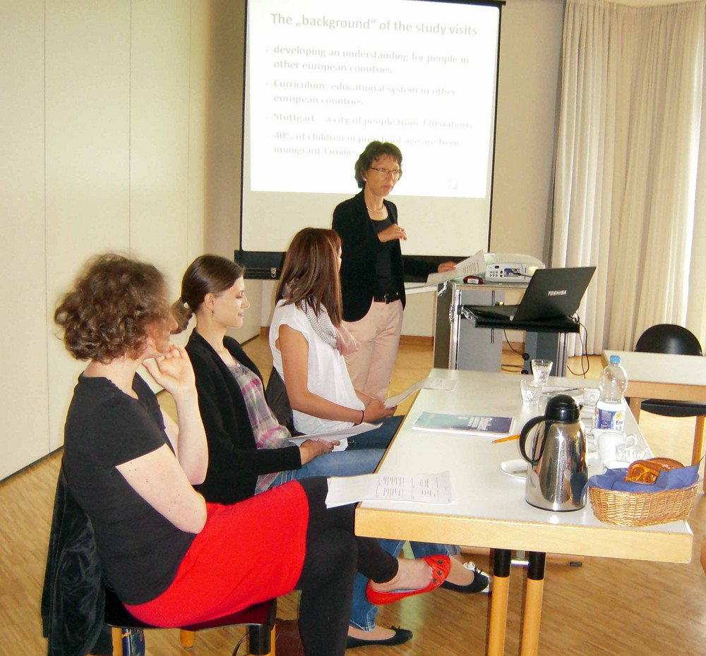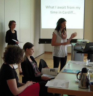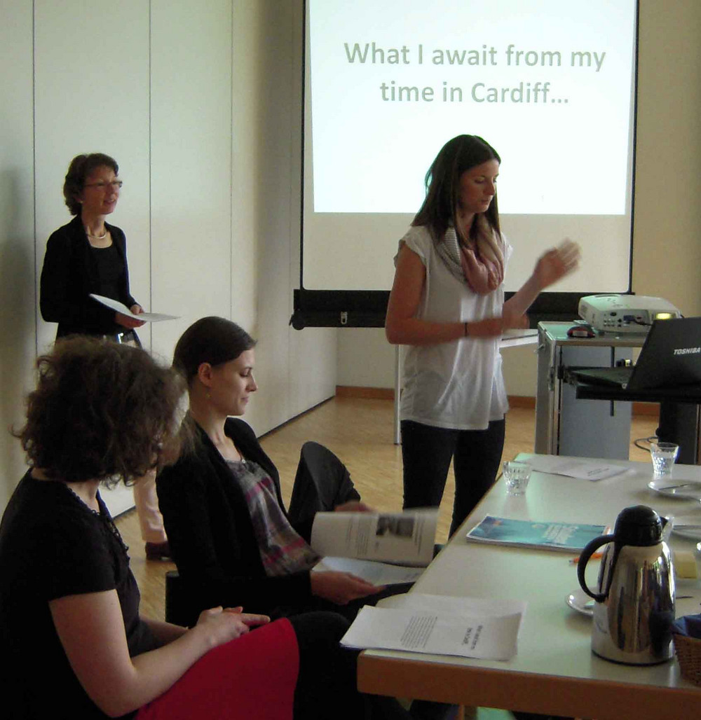Die Delegation informierte sich über Ziele und Programm unserer jährlichen Studienfahrten nach Cardiff. Regine Böhm, Dozentin und Organisatorin der Studienfahrten, gab gemeinsam mit Carina Bauer und Elena Boo Dieguez, Absolventinnen der praxisintegrierten Ausbildung, einen Einblick in Hintergründe, Partner in Cardiff und praktische Erfahrungen. Levke Bell (PiA-Schülerin in Klasse 1) unterstützte uns als englische Muttersprachlerin.